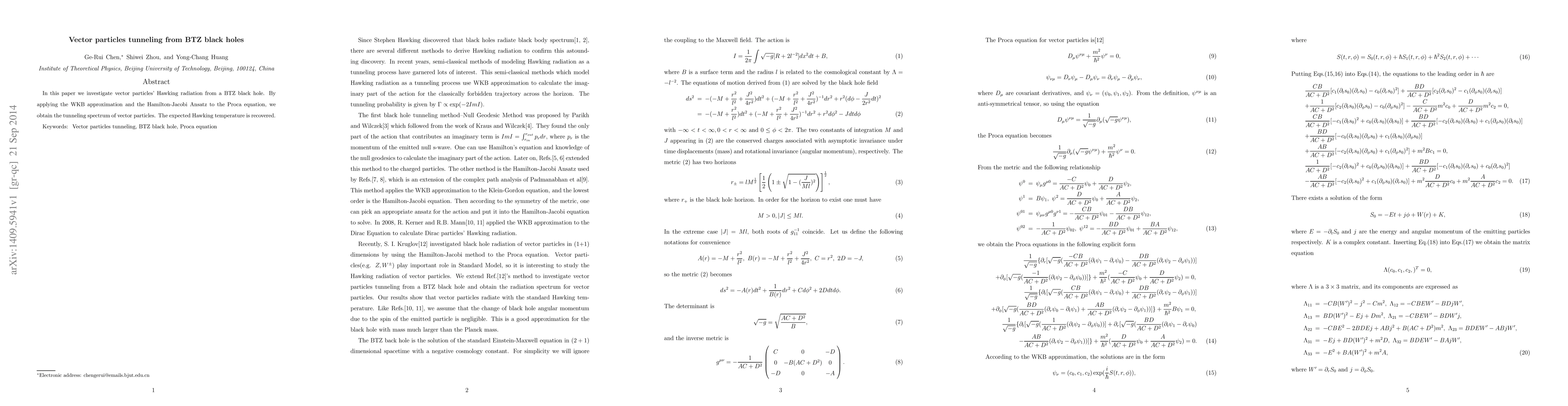 Summary: This research explores vector particles' Hawking radiation from BTZ black holes using the WKB approximation and the Hamilton-Jacobi Ansatz on the Proca equation, revealing the tunneling spectrum and confirming the expected Hawking temperature.