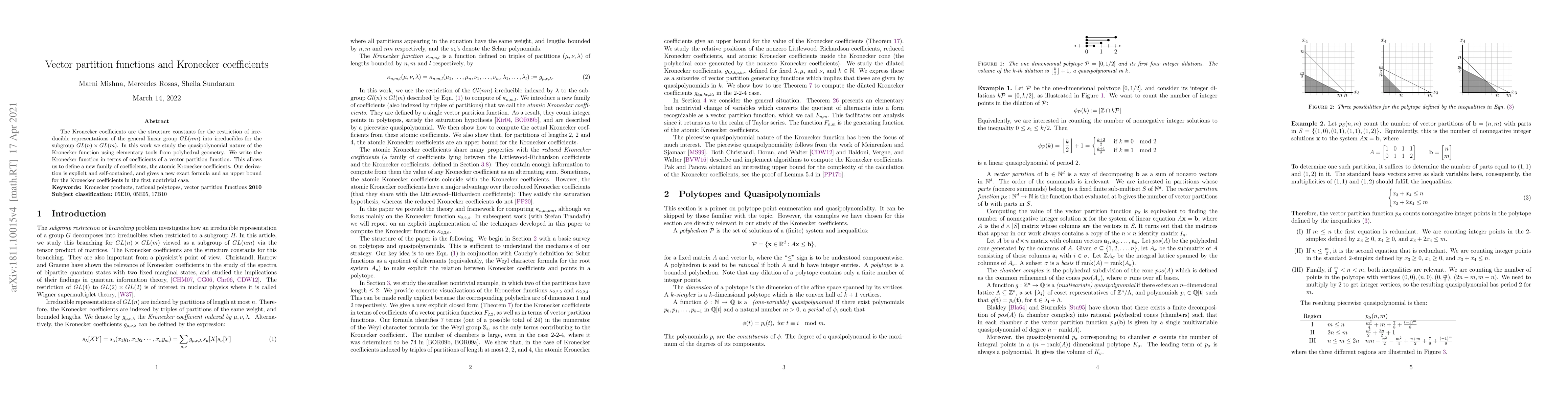 The Kronecker coefficients are the structure constants for the restriction of irreducible representations of the general linear group $GL(n m)$ into irreducibles for the subgroup $GL(n)\times GL(m)$. In this work we study the quasipolynomial nature of the Kronecker function using elementary tools from polyhedral geometry. We write the Kronecker function in terms of coefficients of a vector partition function. This allows us to define a new family of coefficients, the atomic Kronecker coefficients. Our derivation is explicit and self-contained, and gives a new exact formula and an upper bound for the Kronecker coefficients in the first nontrivial case.