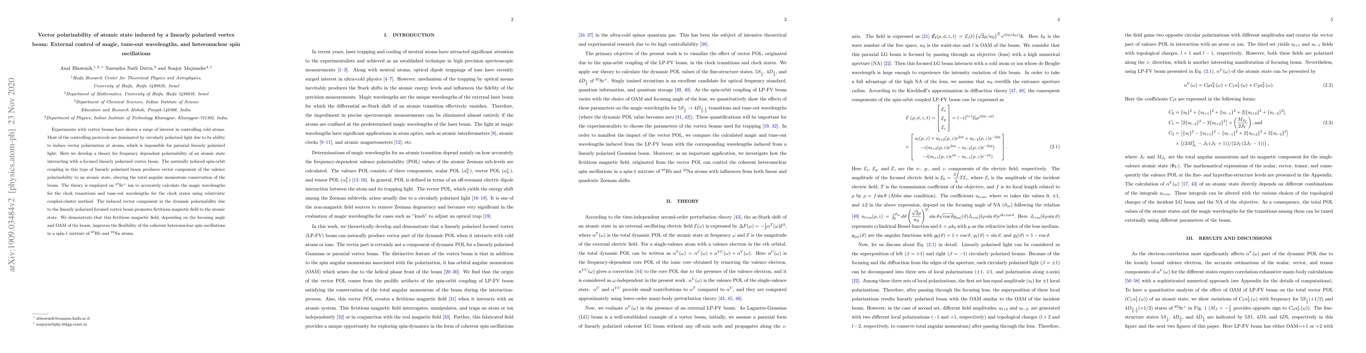 This paper develops a theory for the vector polarizability of atomic states induced by a focused linearly polarized vortex beam, demonstrating its ability to control cold atoms and enhance heteronuclear spin oscillations. The study calculates magic and tune-out wavelengths for clock transitions in $^{87}$Sr$^{+}$ ions and shows how the induced vector component promotes coherent spin oscillations in a spin-1 mixture of $^{87}$Rb and $^{23}$Na atoms.