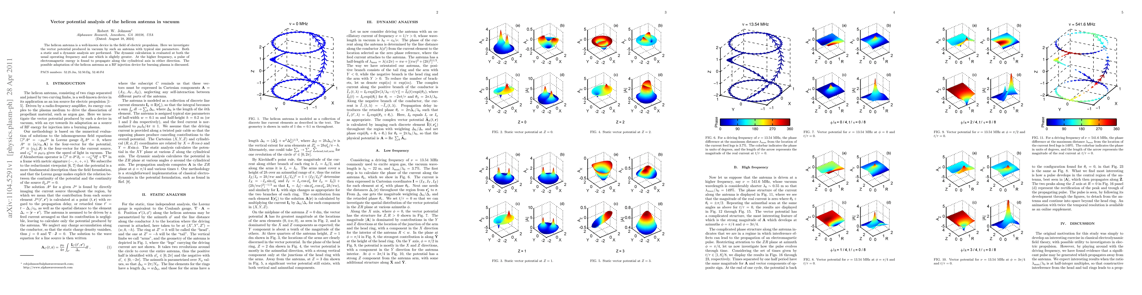 The helicon antenna is a well-known device in the field of electric propulsion. Here we investigate the vector potential produced in vacuum by such an antenna with typical size parameters. Both a static and a dynamic analysis are performed. The dynamic calculation is evaluated at both the usual operating frequency and one which is slightly greater. At the higher frequency, a pulse of electromagnetic energy is found to propagate along the cylindrical axis in either direction. The possible adaptation of the helicon antenna as a RF injection device for burning plasma is discussed.