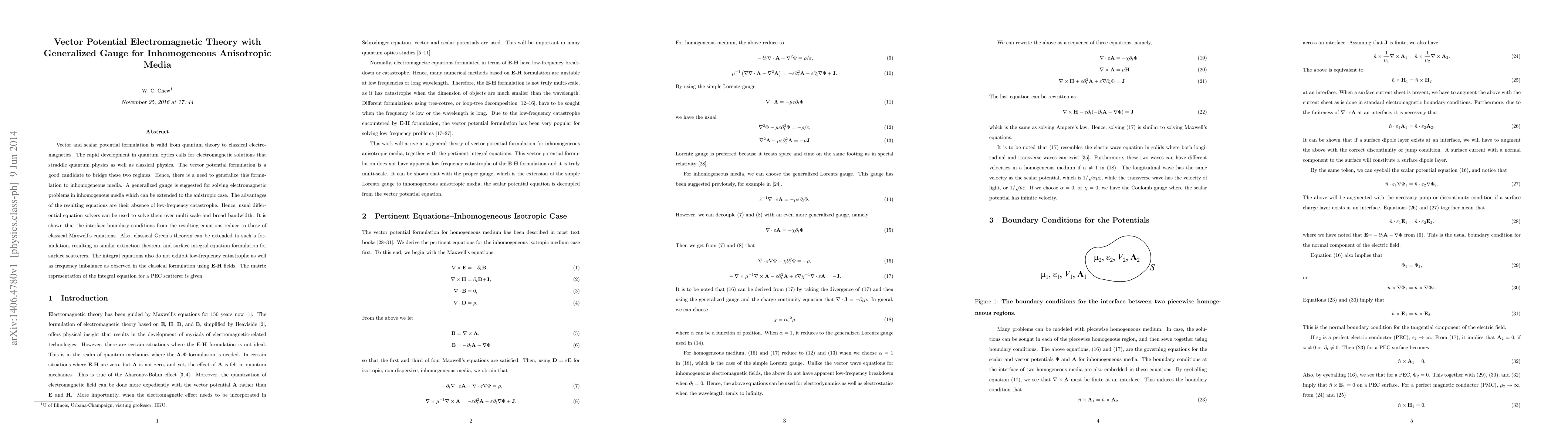 Vector and scalar potential formulation is valid from quantum theory to classical electromagnetics. The rapid development in quantum optics calls for electromagnetic solutions that straddle quantum physics as well as classical physics. The vector potential formulation is a good candidate to bridge these two regimes. Hence, there is a need to generalize this formulation to inhomogeneous media. A generalized gauge is suggested for solving electromagnetic problems in inhomogenous media which can be extended to the anistropic case. The advantages of the resulting equations are their absence of low-frequency catastrophe. Hence, usual differential equation solvers can be used to solve them over multi-scale and broad bandwidth. It is shown that the interface boundary conditions from the resulting equations reduce to those of classical Maxwell's equations. Also, classical Green's theorem can be extended to such a formulation, resulting in similar extinction theorem, and surface integral equation formulation for surface scatterers. The integral equations also do not exhibit low-frequency catastrophe as well as frequency imbalance as observed in the classical formulation using E-H fields. The matrix representation of the integral equation for a PEC scatterer is given.