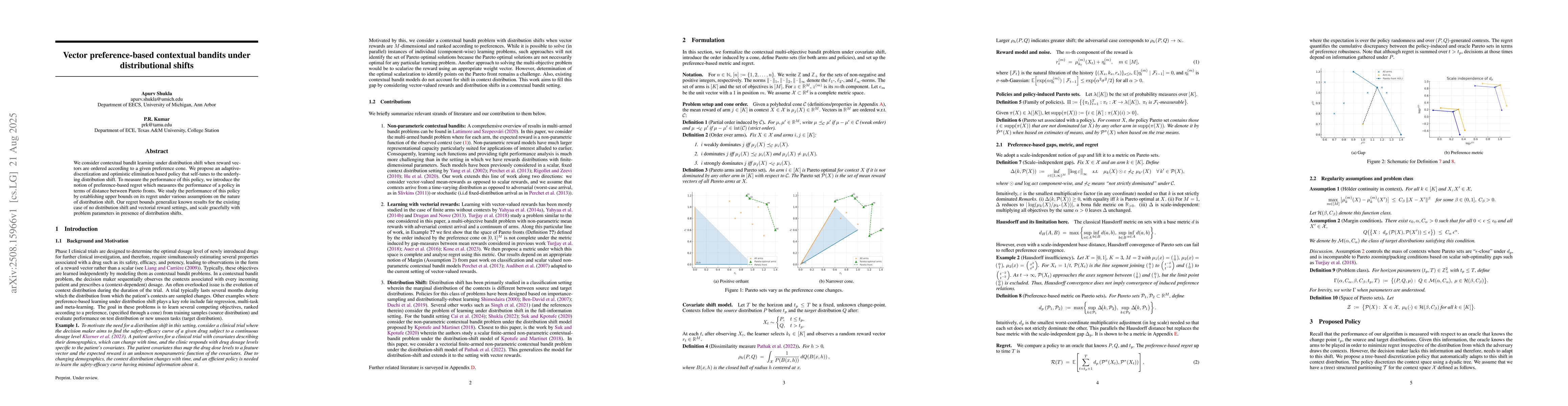 We consider contextual bandit learning under distribution shift when reward vectors are ordered according to a given preference cone. We propose an adaptive-discretization and optimistic elimination based policy that self-tunes to the underlying distribution shift. To measure the performance of this policy, we introduce the notion of preference-based regret which measures the performance of a policy in terms of distance between Pareto fronts. We study the performance of this policy by establishing upper bounds on its regret under various assumptions on the nature of distribution shift. Our regret bounds generalize known results for the existing case of no distribution shift and vectorial reward settings, and scale gracefully with problem parameters in presence of distribution shifts.