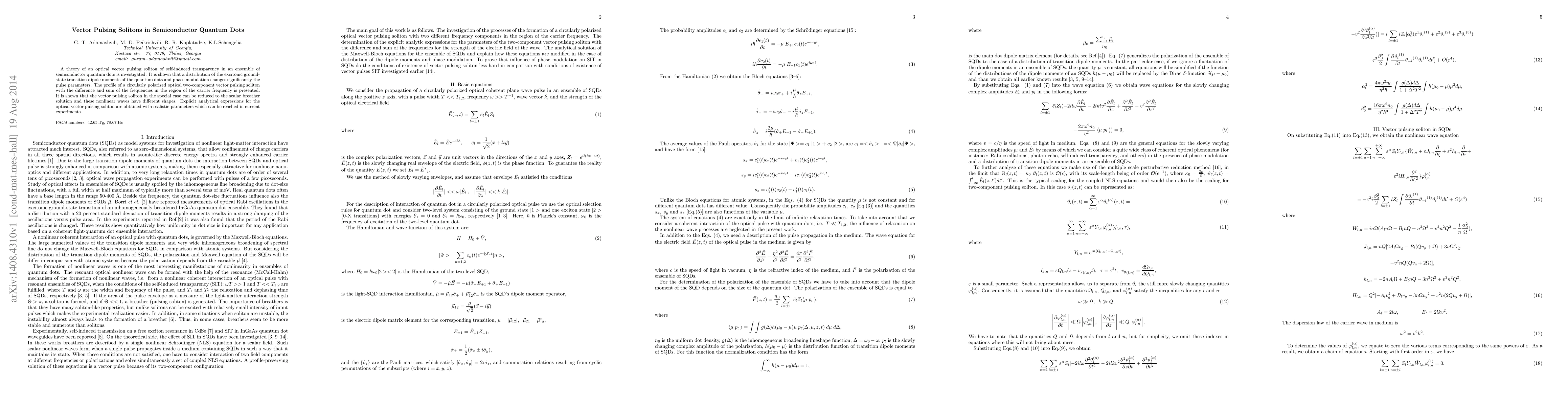 This paper investigates the theory of optical vector pulsing solitons in semiconductor quantum dots, demonstrating how excitonic dipole moments and phase modulation alter pulse parameters. Analytical expressions for these nonlinear waves are derived, showing that vector solitons can reduce to scalar breathers under specific conditions.