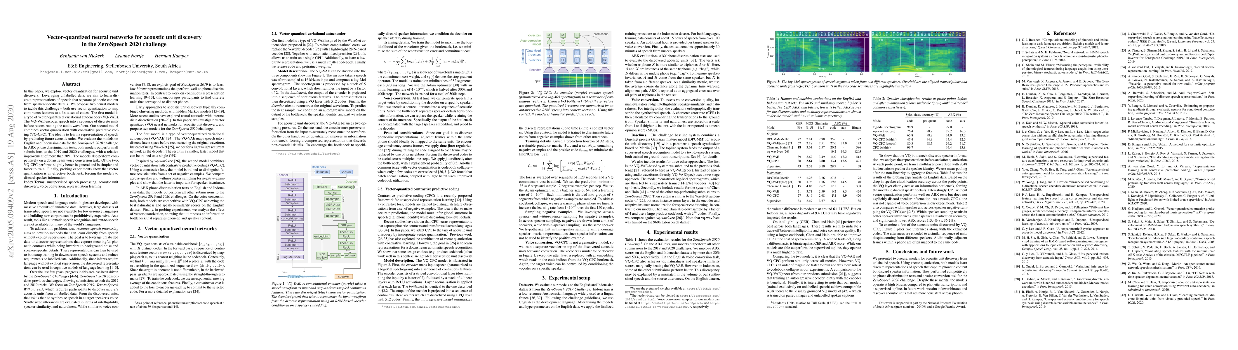 This paper proposes two neural models using vector quantization for acoustic unit discovery, achieving superior performance in the ZeroSpeech 2020 challenge. The VQ-VAE and VQ-CPC models outperform previous submissions, with VQ-CPC showing slightly better results and being simpler and faster to train.