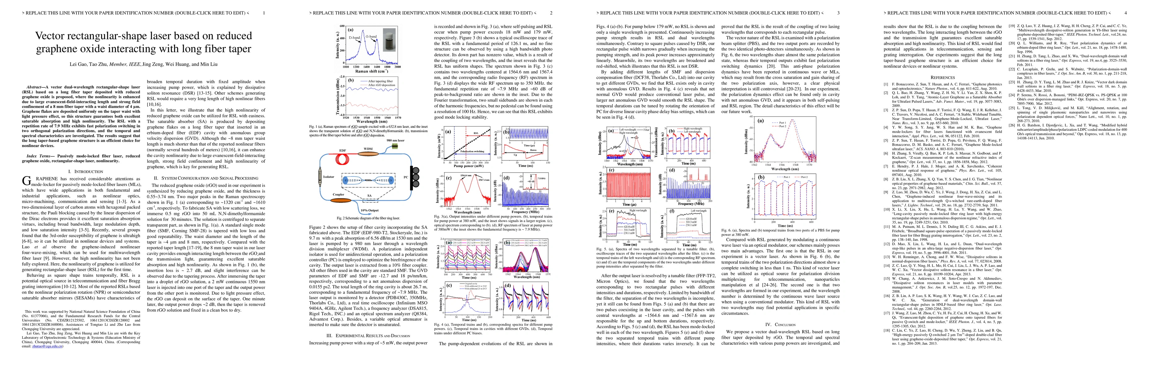 This paper proposes a vector dual-wavelength rectangular-shape laser based on a long fiber taper coated with reduced graphene oxide, achieving enhanced nonlinearity and saturable absorption. The structure demonstrates efficient polarization switching and is identified as a promising candidate for nonlinear optical devices.