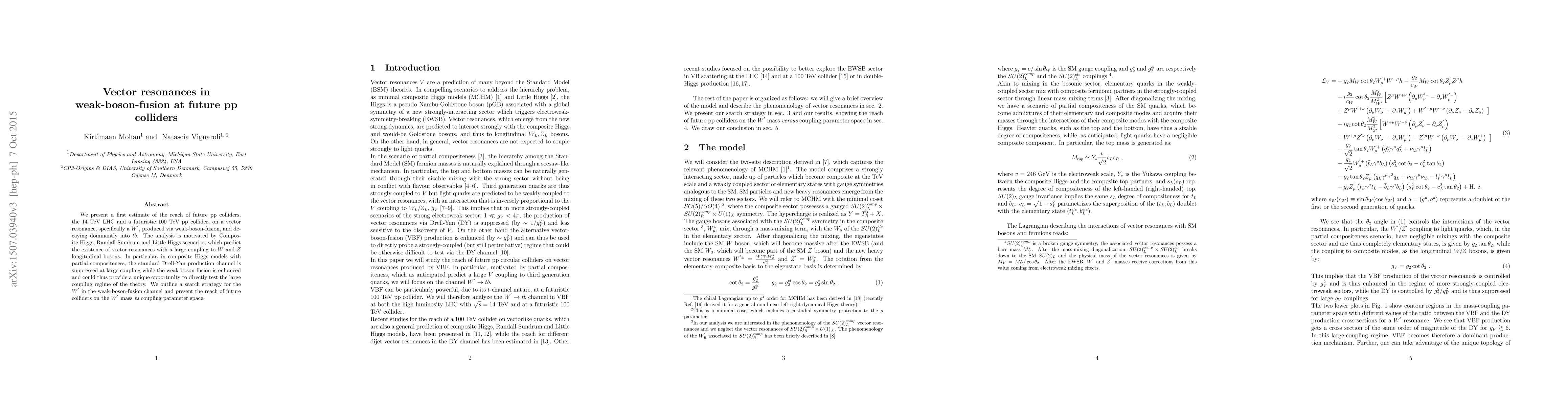 We present a first estimate of the reach of future pp colliders, the 14 TeV LHC and a futuristic 100 TeV pp collider, on a vector resonance, specifically a $W^{'}$, produced via weak-boson-fusion, and decaying dominantly into $tb$. The analysis is motivated by Composite Higgs, Randall-Sundrum and Little Higgs scenarios, which predict the existence of vector resonances with a large coupling to $W$ and $Z$ longitudinal bosons. In particular, in composite Higgs models with partial compositeness, the standard Drell-Yan production channel is suppressed at large coupling while the weak-boson-fusion is enhanced and could thus provide a unique opportunity to directly test the large coupling regime of the theory. We outline a search strategy for the $W^{'}$ in the weak-boson-fusion channel and present the reach of future colliders on the $W^{'}$ mass-coupling parameter space.