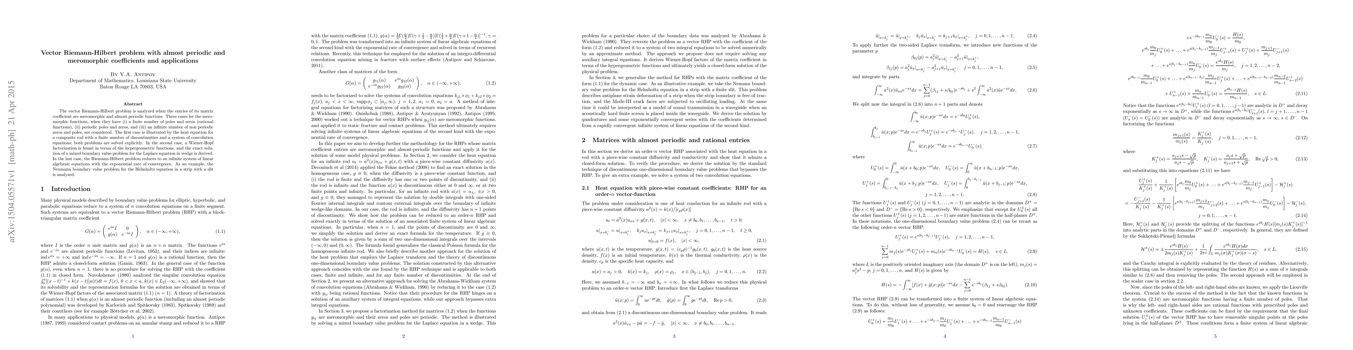 The vector Riemann-Hilbert problem is analyzed when the entries of its matrix coefficient are meromorphic and almost periodic functions. Three cases for the meromorphic functions, when they have (i) a finite number of poles and zeros (rational functions), (ii) periodic poles and zeros, and (iii) an infinite number of non periodic zeros and poles, are considered. The first case is illustrated by the heat equation for a composite rod with a finite number of discontinuities and a system of convolution equations; both problems are solved explicitly. In the second case, a Wiener-Hopf factorization is found in terms of the hypergeometric functions, and the exact solution of a mixed boundary value problem for the Laplace equation in wedge is derived. In the last case, the Riemann-Hilbert problem reduces to an infinite system of linear algebraic equations with the exponential rate of convergence. As an example, the Neumann boundary value problem for the Helmholtz equation in a strip with a slit is analyzed.