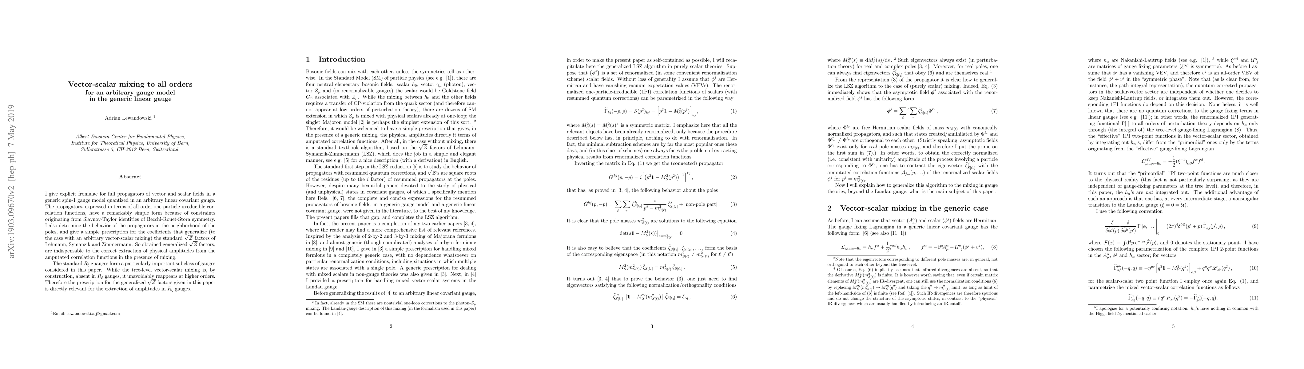 I give explicit fromulae for full propagators of vector and scalar fields in a generic spin-1 gauge model quantized in an arbitrary linear covariant gauge. The propagators, expressed in terms of all-order one-particle-irreducible correlation functions, have a remarkably simple form because of constraints originating from Slavnov-Taylor identities of Becchi-Rouet-Stora symmetry. I also determine the behavior of the propagators in the neighborhood of the poles, and give a simple prescription for the coefficients that generalize (to the case with an arbitrary vector-scalar mixing) the standard $\sqrt{\mathcal{Z}}$ factors of Lehmann, Symanzik and Zimmermann. So obtained generalized $\sqrt{\mathcal{Z}}$ factors, are indispensable to the correct extraction of physical amplitudes from the amputated correlation functions in the presence of mixing. The standard $R_\xi$ guauges form a particularly important subclass of gauges considered in this paper. While the tree-level vector-scalar mixing is, by construction, absent in $R_\xi$ gauges, it unavoidably reappears at higher orders. Therefore the prescription for the generalized $\sqrt{\mathcal{Z}}$ factors given in this paper is directly relevant for the extraction of amplitudes in $R_\xi$ gauges.