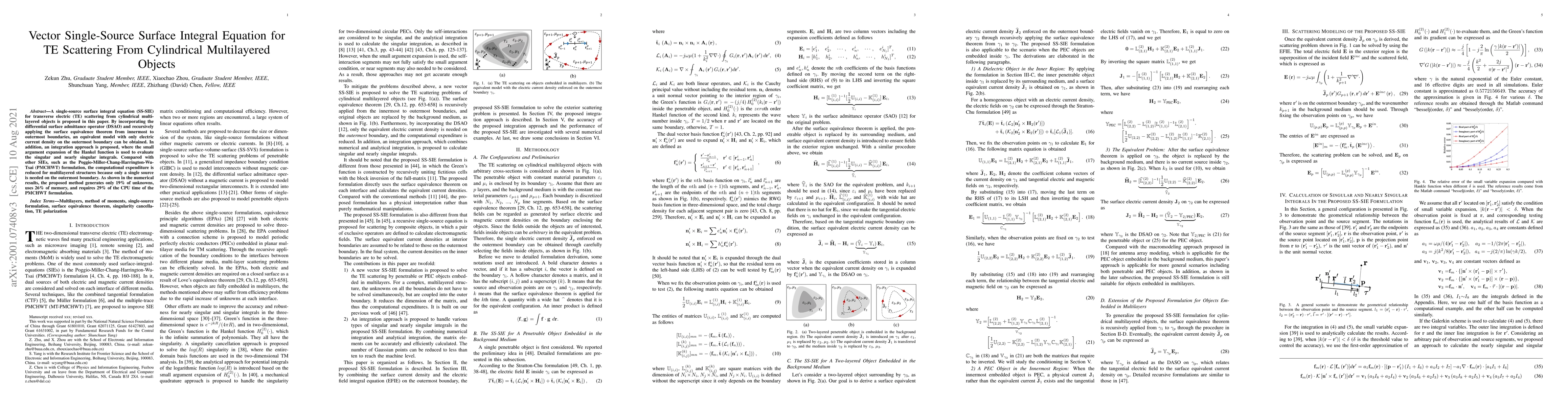 This paper proposes a vector single-source surface integral equation (SS-SIE) for TE scattering from cylindrical multilayered objects, reducing computational costs by using only a single source on the outermost boundary. The method employs the differential surface admittance operator and small argument expansion of the Hankel function, achieving significant reductions in unknowns, memory usage, and CPU time compared to the PMCHWT formulation.