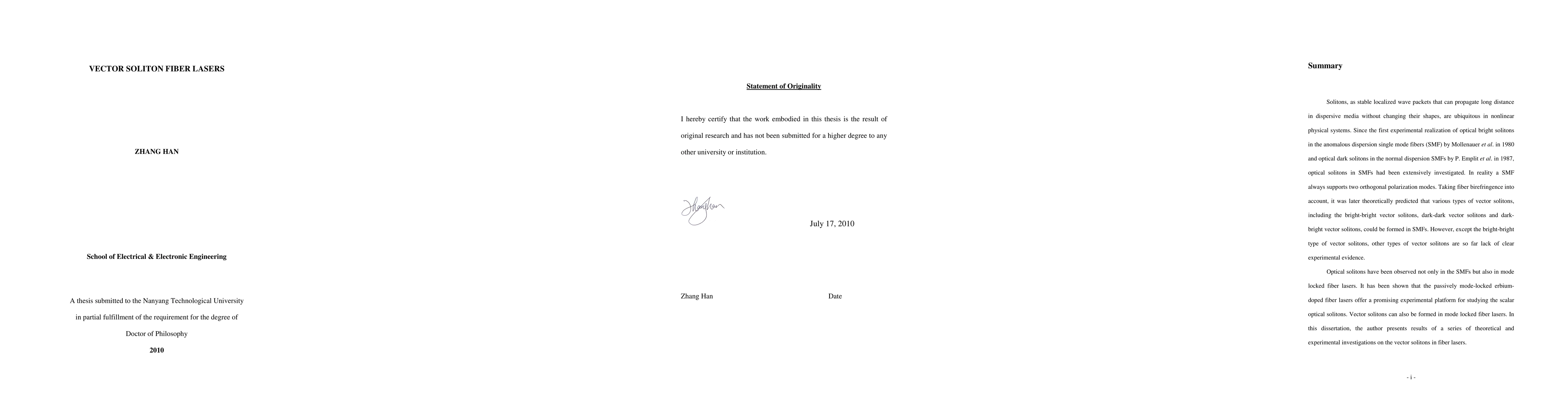 Solitons, as stable localized wave packets that can propagate long distance in dispersive media without changing their shapes, are ubiquitous in nonlinear physical systems. Since the first experimental realization of optical bright solitons in the anomalous dispersion single mode fibers (SMF) by Mollenauer et al. in 1980 and optical dark solitons in the normal dispersion SMFs by P. Emplit et al. in 1987, optical solitons in SMFs had been extensively investigated. In reality a SMF always supports two orthogonal polarization modes. Taking fiber birefringence into account, it was later theoretically predicted that various types of vector solitons, including the bright-bright vector solitons, dark-dark vector solitons and dark-bright vector solitons, could be formed in SMFs. However, except the bright-bright type of vector solitons, other types of vector solitons are so far lack of clear experimental evidence. Optical solitons have been observed not only in the SMFs but also in mode locked fiber lasers. It has been shown that the passively mode-locked erbium-doped fiber lasers offer a promising experimental platform for studying the scalar optical solitons. Vector solitons can also be formed in mode locked fiber lasers. In this dissertation, the author presents results of a series of theoretical and experimental investigations on the vector solitons in fiber lasers.