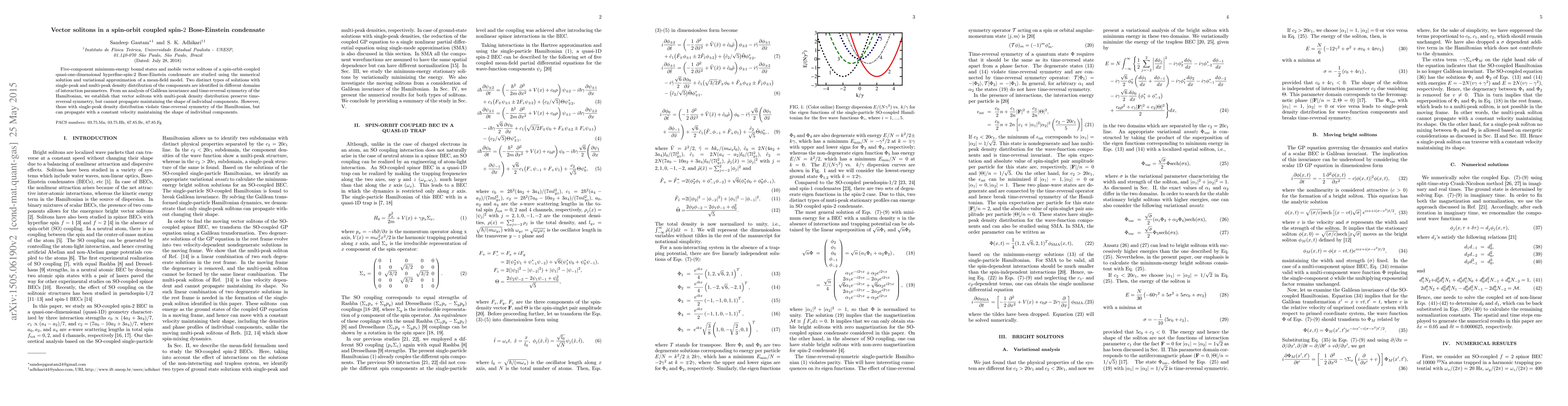 Five-component minimum-energy bound states and mobile vector solitons of a spin-orbit-coupled quasi-one-dimensional hyperfine-spin-2 Bose-Einstein condensate are studied using the numerical solution and variational approximation of a mean-field model. Two distinct types of solutions with single-peak and multi-peak density distribution of the components are identified in different domains of interaction parameters. From an analysis of Galilean invariance and time-reversal symmetry of the Hamiltonian, we establish that vector solitons with multi-peak density distribution preserve time-reversal symmetry, but cannot propagate maintaining the shape of individual components. However, those with single-peak density distribution violate time-reversal symmetry of the Hamiltonian, but can propagate with a constant velocity maintaining the shape of individual components.