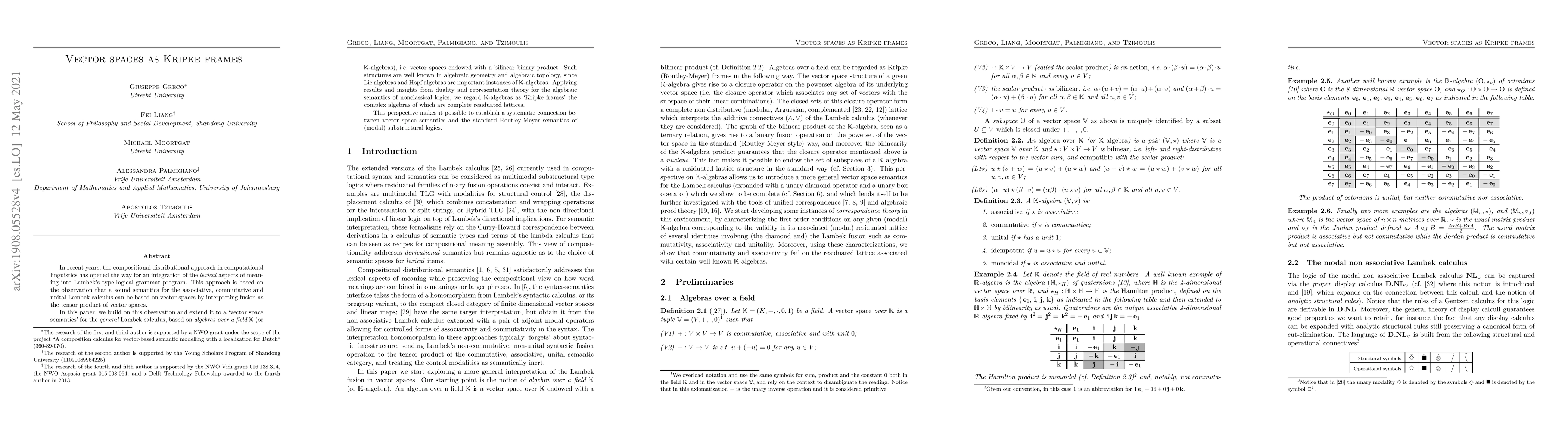 In recent years, the compositional distributional approach in computational linguistics has opened the way for an integration of the \emph{lexical} aspects of meaning into Lambek's type-logical grammar program. This approach is based on the observation that a sound semantics for the associative, commutative and unital Lambek calculus can be based on vector spaces by interpreting fusion as the tensor product of vector spaces. In this paper, we build on this observation and extend it to a `vector space semantics' for the \emph{general} Lambek calculus, based on \emph{algebras over a field} $\mathbb{K}$ (or $\mathbb{K}$-algebras), i.e. vector spaces endowed with a bilinear binary product. Such structures are well known in algebraic geometry and algebraic topology, since they are important instances of Lie algebras and Hopf algebras. Applying results and insights from duality and representation theory for the algebraic semantics of nonclassical logics, we regard $\mathbb{K}$-algebras as `Kripke frames' the complex algebras of which are complete residuated lattices. This perspective makes it possible to establish a systematic connection between vector space semantics and the standard Routley-Meyer semantics of (modal) substructural logics.