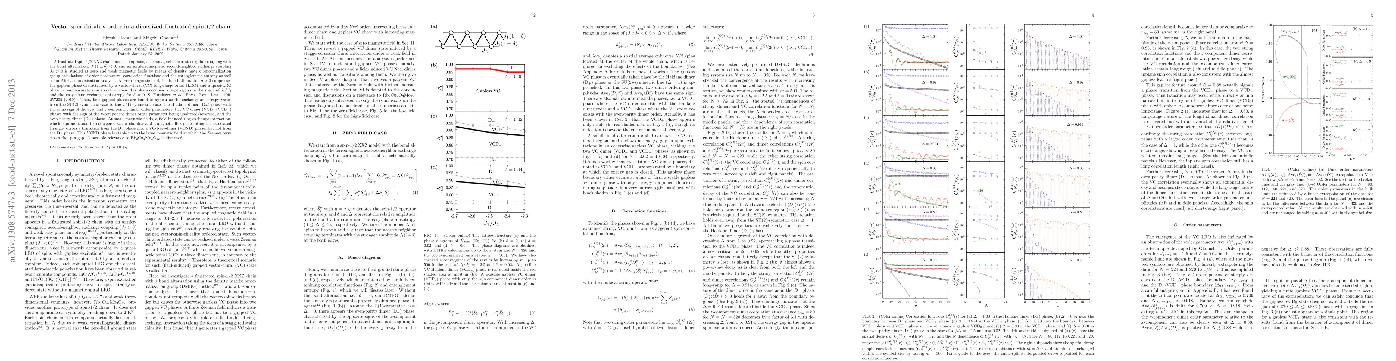 This paper investigates a frustrated spin-1/2 XXZ chain model with bond alternation and varying exchange couplings, revealing multiple gapped phases including Haldane, vector-spin-chirality, and even-parity dimer phases. At small magnetic fields, the system transitions to a vector-spin-chirality Neel-dimer phase, relevant to the material Rb$_2$Cu$_2$Mo$_3$O$_{12}$.