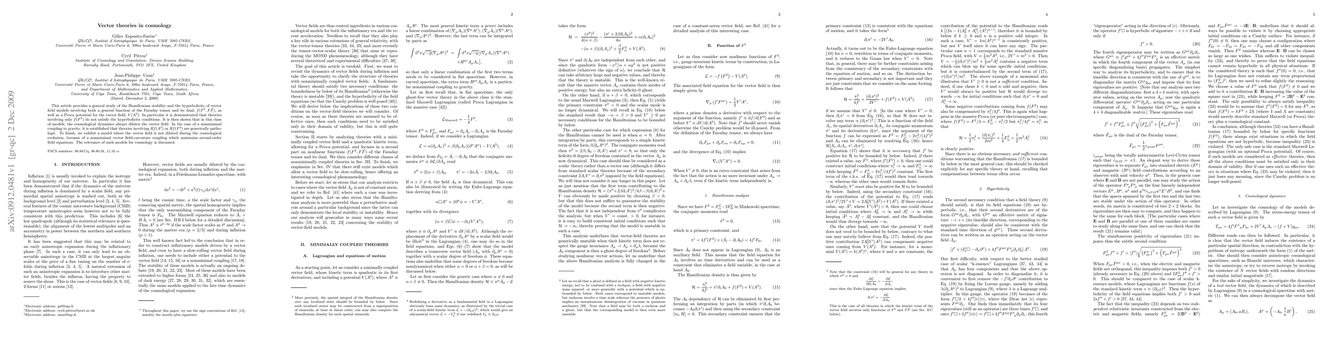 This article provides a general study of the Hamiltonian stability and the hyperbolicity of vector field models involving both a general function of the Faraday tensor and its dual, $f(F^2,F\tilde F)$, as well as a Proca potential for the vector field, $V(A^2)$. In particular it is demonstrated that theories involving only $f(F^2)$ do not satisfy the hyperbolicity conditions. It is then shown that in this class of models, the cosmological dynamics always dilutes the vector field. In the case of a nonminimal coupling to gravity, it is established that theories involving $R f(A^2)$ or $Rf(F^2)$ are generically pathologic. To finish, we exhibit a model where the vector field is not diluted during the cosmological evolution, because of a nonminimal vector field-curvature coupling which maintains second-order field equations. The relevance of such models for cosmology is discussed.