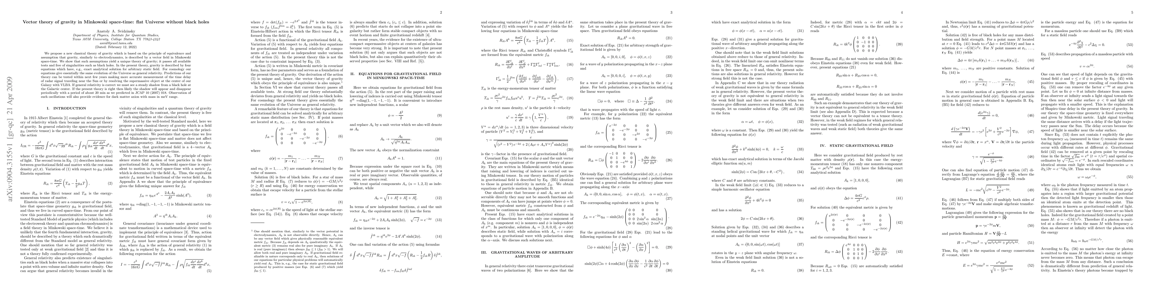 This paper proposes a new classical vector theory of gravity in Minkowski space-time, which avoids singularities like black holes and aligns with the equivalence principle. Predictions include periodic shadow oscillations at the Galactic center and potential evidence for dark matter axions.