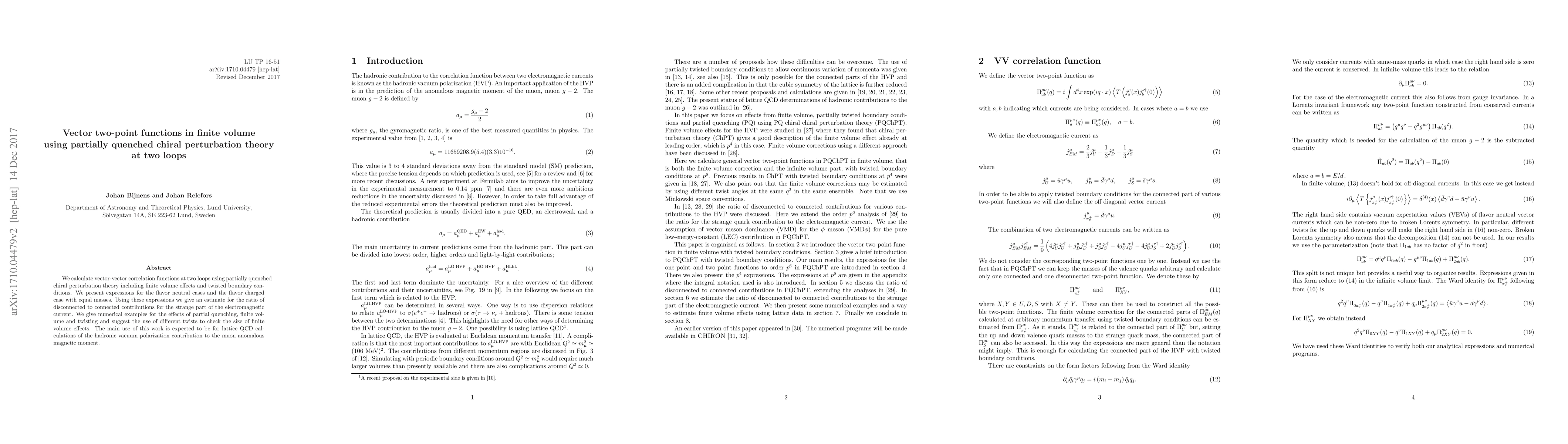 We calculate vector-vector correlation functions at two loops using partially quenched chiral perturbation theory including finite volume effects and twisted boundary conditions. We present expressions for the flavor neutral cases and the flavor charged case with equal masses. Using these expressions we give an estimate for the ratio of disconnected to connected contributions for the strange part of the electromagnetic current. We give numerical examples for the effects of partial quenching, finite volume and twisting and suggest the use of different twists to check the size of finite volume effects. The main use of this work is expected to be for lattice QCD calculations of the hadronic vacuum polarization contribution to the muon anomalous magnetic moment.