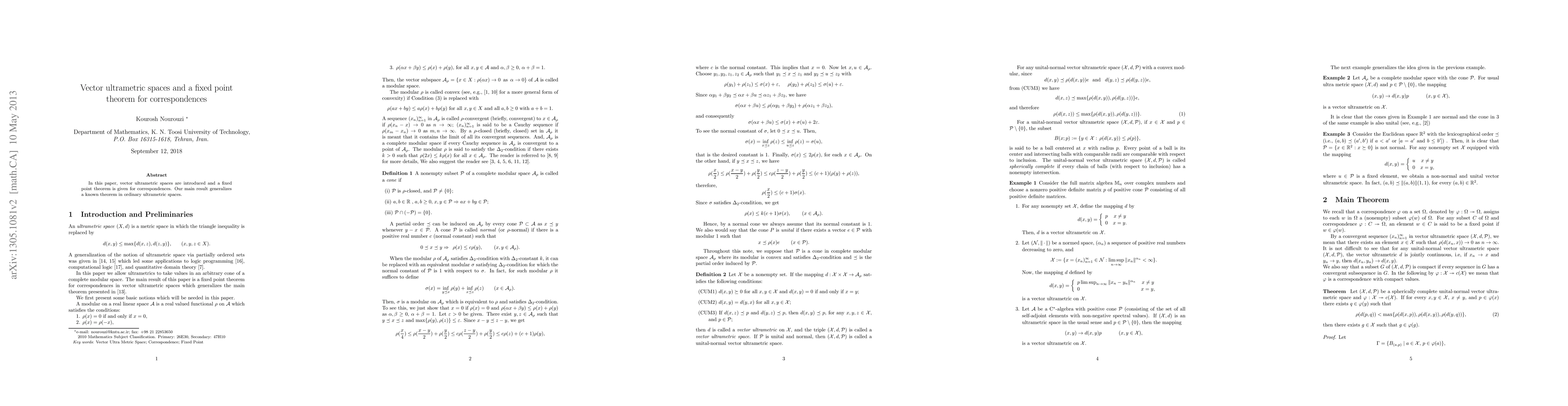 This paper introduces vector ultrametric spaces and presents a fixed point theorem for correspondences, generalizing a well-known result from ordinary ultrametric spaces. The new theorem extends existing fixed point theory to this more complex framework.