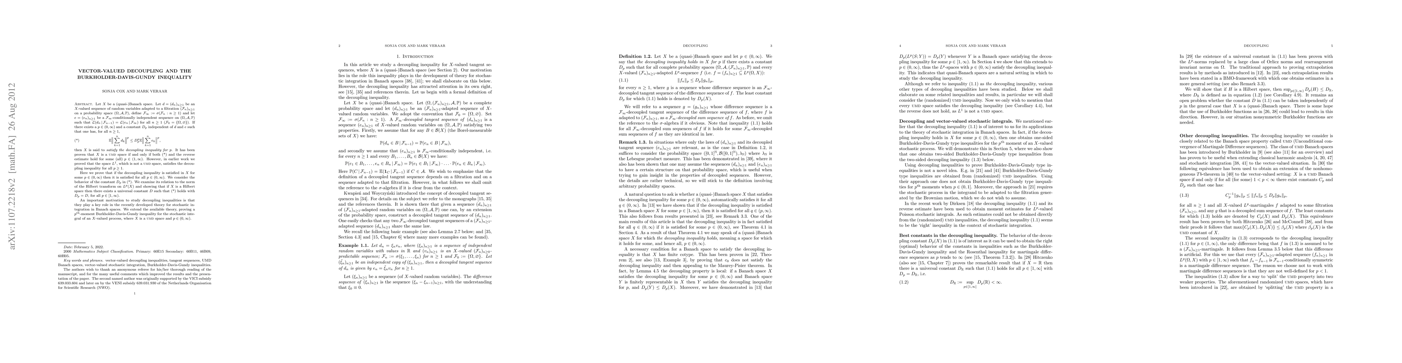 This paper proves p-independence of the one-sided decoupling inequality for Banach space-valued tangent martingales, establishing optimal constants for various spaces and providing an upper estimate of order p. It also derives Burkholder-Davis-Gundy type estimates for p-th moments of X-valued stochastic integrals under certain conditions.