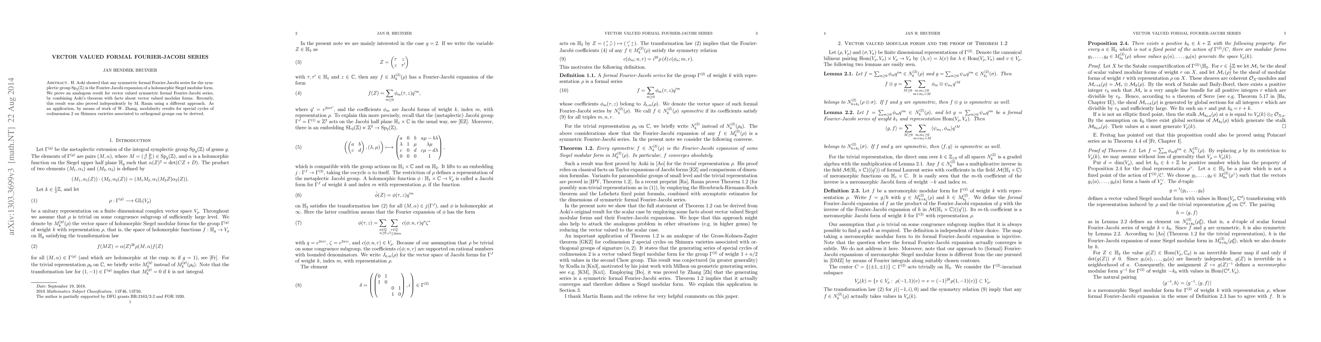 This paper proves that vector valued symmetric formal Fourier-Jacobi series for the symplectic group correspond to holomorphic Siegel modular forms, extending a result by H. Aoki. It also applies this to derive modularity results for special cycles on Shimura varieties.