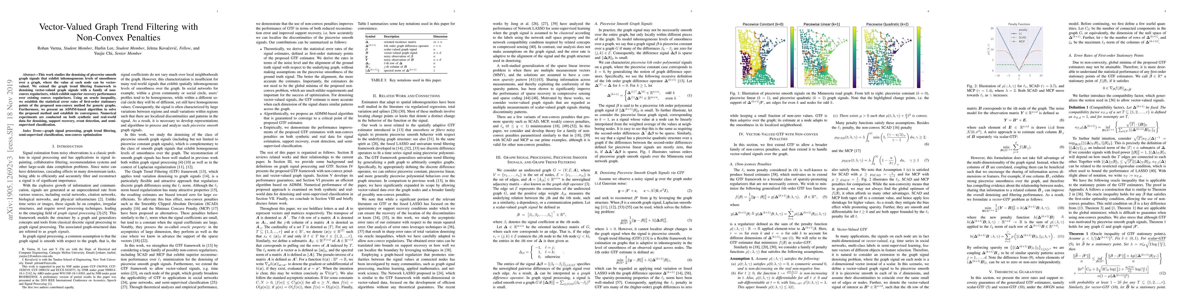 This paper proposes a method for denoising vector-valued graph signals using non-convex penalties, demonstrating superior performance over convex regularizers. It establishes statistical error rates and presents an ADMM-based algorithm for efficient computation, validated through experiments on synthetic and real-world data.