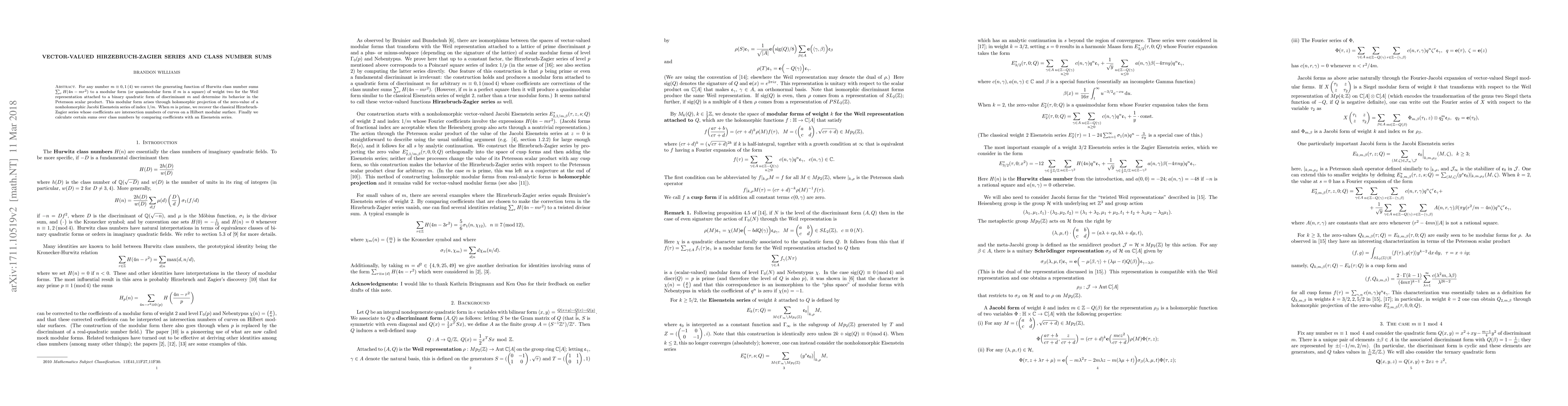 For any number $m \equiv 0,1 \, (4)$ we correct the generating function of Hurwitz class number sums $\sum_r H(4n - mr^2)$ to a modular form (or quasimodular form if $m$ is a square) of weight two for the Weil representation attached to a binary quadratic form of discriminant $m$ and determine its behavior in the Petersson scalar product. This modular form arises through holomorphic projection of the zero-value of a nonholomorphic Jacobi Eisenstein series of index $1/m$. When $m$ is prime, we recover the classical Hirzebruch-Zagier series whose coefficients are intersection numbers of curves on a Hilbert modular surface. Finally we calculate certain sums over class numbers by comparing coefficients with an Eisenstein series.