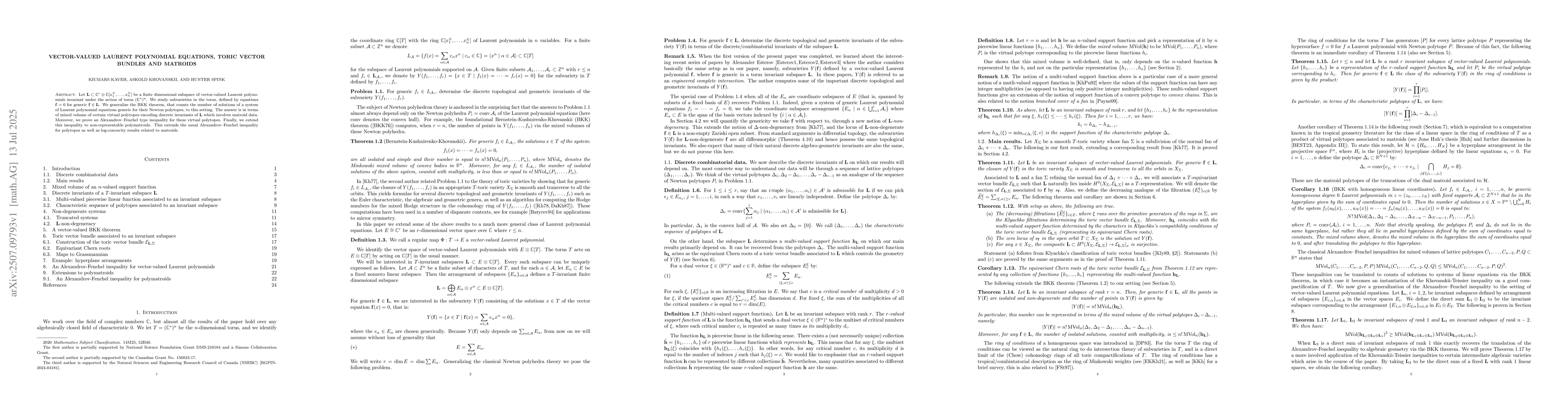 Let $L \subset \mathbb{C}^r \otimes \mathbb{C}[x_1^\pm, \ldots, x_n^\pm]$ be a finite dimensional subspace of vector-valued Laurent polynomials invariant under the action of torus $(\mathbb{C}^*)^n$. We study subvarieties in the torus, defined by equations $f = 0$ for generic $f \in L$. We generalize the BKK theorem, that counts the number of solutions of a system of Laurent polynomial equations generic for their Newton polytopes, to this setting. The answer is in terms of mixed volume of certain virtual polytopes encoding discrete invariants of $L$ which involves matroid data. Moreover, we prove an Alexandrov-Fenchel type inequality for these virtual polytopes. Finally, we extend this inequality to non-representable polymatroids. This extends the usual Alexandrov-Fenchel inequality for polytopes as well as log-concavity results related to matroids.
