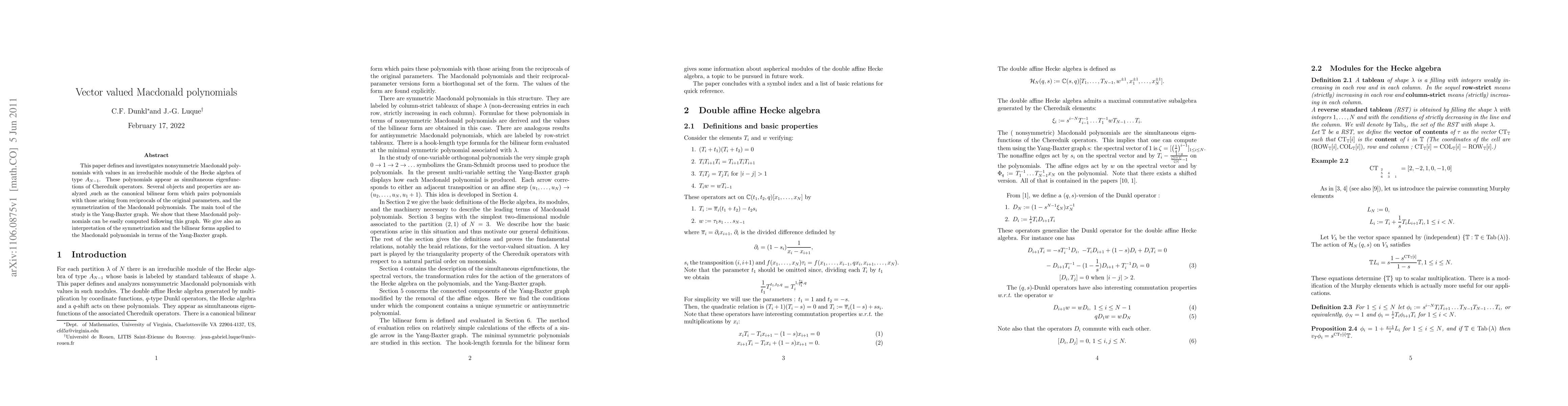 This paper introduces vector-valued Macdonald polynomials in an irreducible module of the Hecke algebra and explores their properties, including a canonical bilinear form and symmetrization. The study leverages the Yang-Baxter graph to facilitate computation and offers interpretations of symmetrization and bilinear forms through this graph.