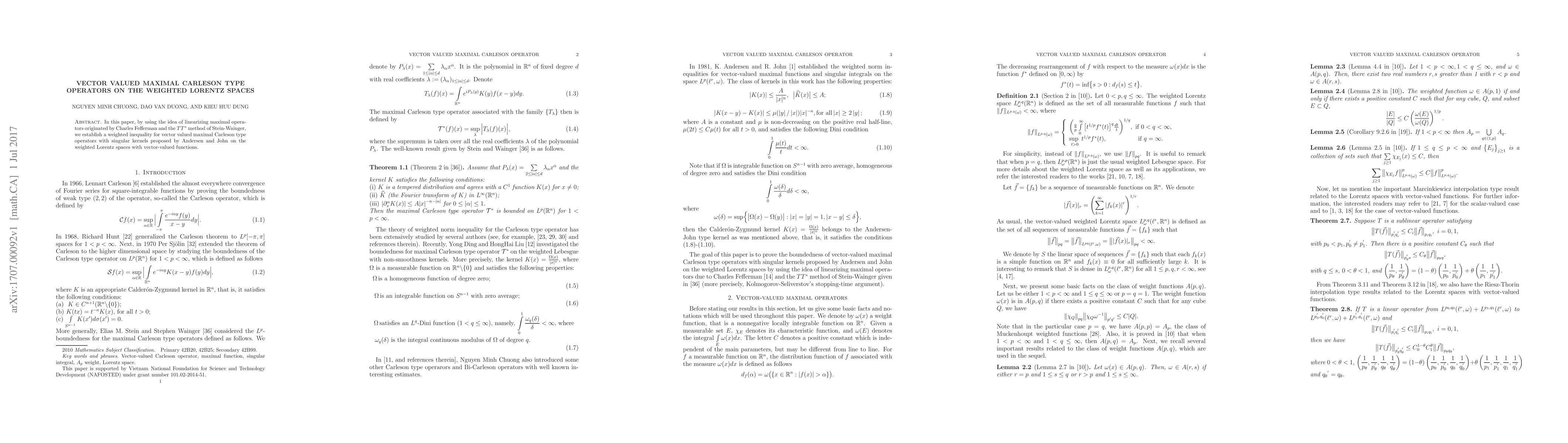 Researchers establish a weighted inequality for vector-valued maximal Carleson type operators on weighted Lorentz spaces, building on Fefferman's idea of linearizing maximal operators and the Stein-Wainger TT* method.