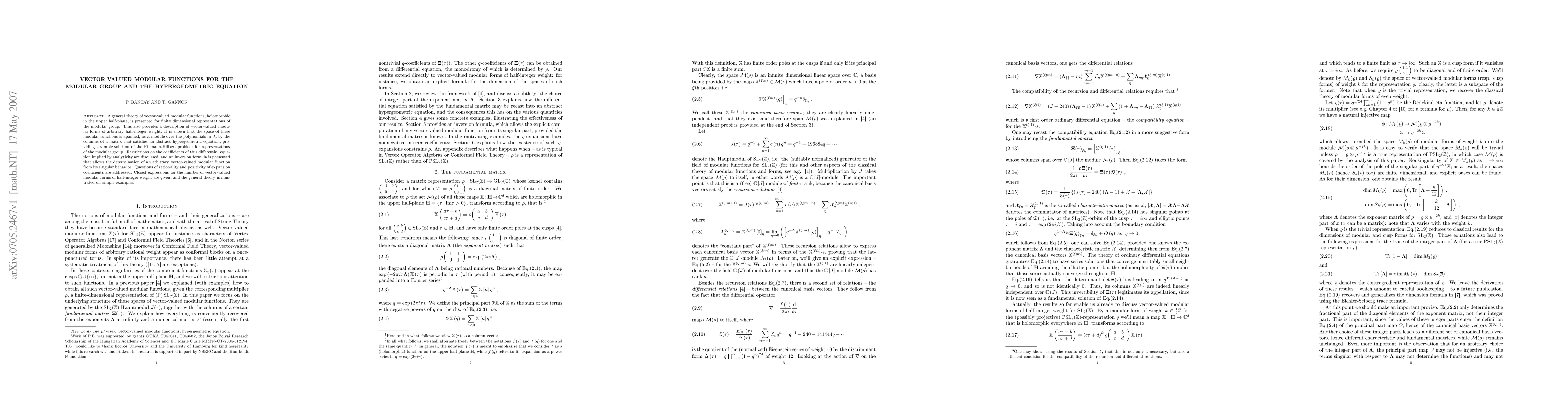 A general theory of vector-valued modular functions, holomorphic in the upper half-plane, is presented for finite dimensional representations of the modular group. This also provides a description of vector-valued modular forms of arbitrary half-integer weight. It is shown that the space of these modular functions is spanned, as a module over the polynomials in J, by the columns of a matrix that satisfies an abstract hypergeometric equation, providing a simple solution of the Riemann-Hilbert problem for representations of the modular group. Restrictions on the coefficients of this differential equation implied by analyticity are discussed, and an inversion formula is presented that allows the determination of an arbitrary vector-valued modular function from its singular behavior. Questions of rationality and positivity of expansion coefficients are addressed. Closed expressions for the number of vector-valued modular forms of half-integer weight are given, and the general theory is illustrated on simple examples.