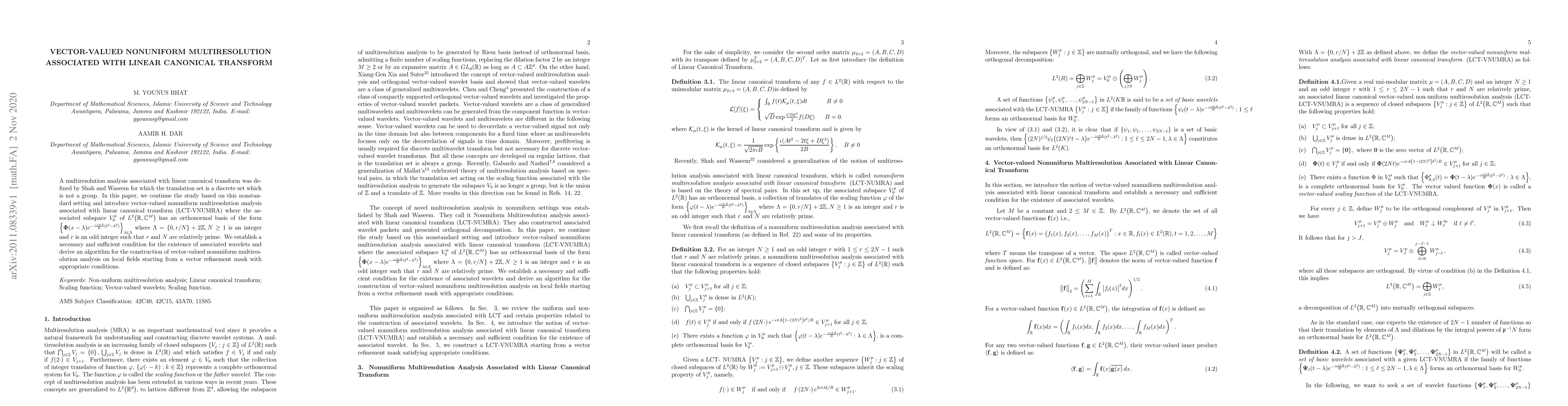 The paper introduces vector-valued nonuniform multiresolution analysis associated with the linear canonical transform, providing conditions for wavelet existence and a construction algorithm.