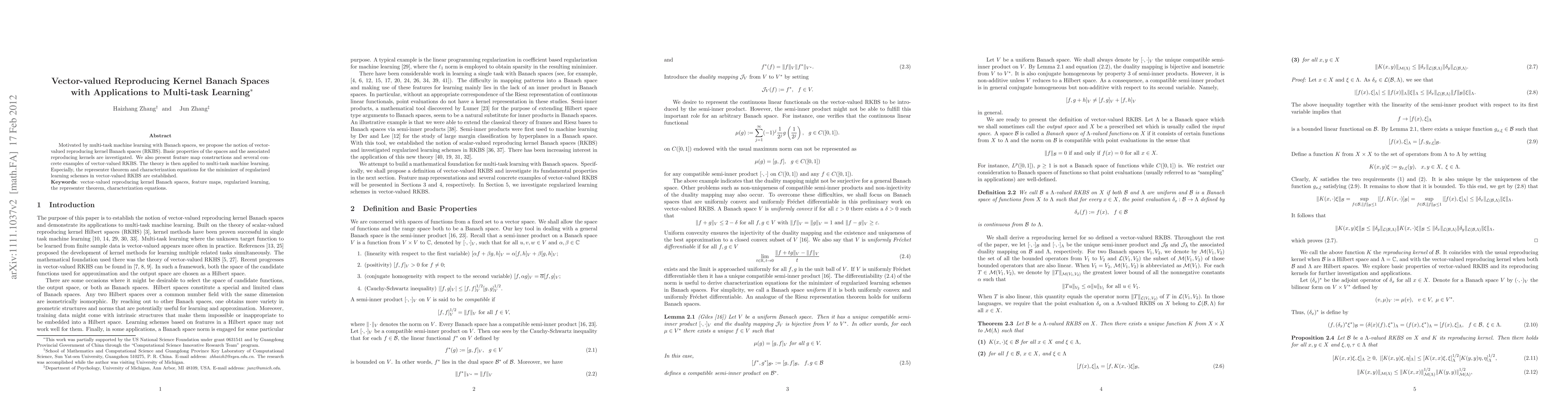 This paper introduces vector-valued reproducing kernel Banach spaces (RKBS) for multi-task machine learning, exploring their properties and feature maps. It applies the theory to multi-task learning, establishing the representer theorem and equations for regularized learning schemes.