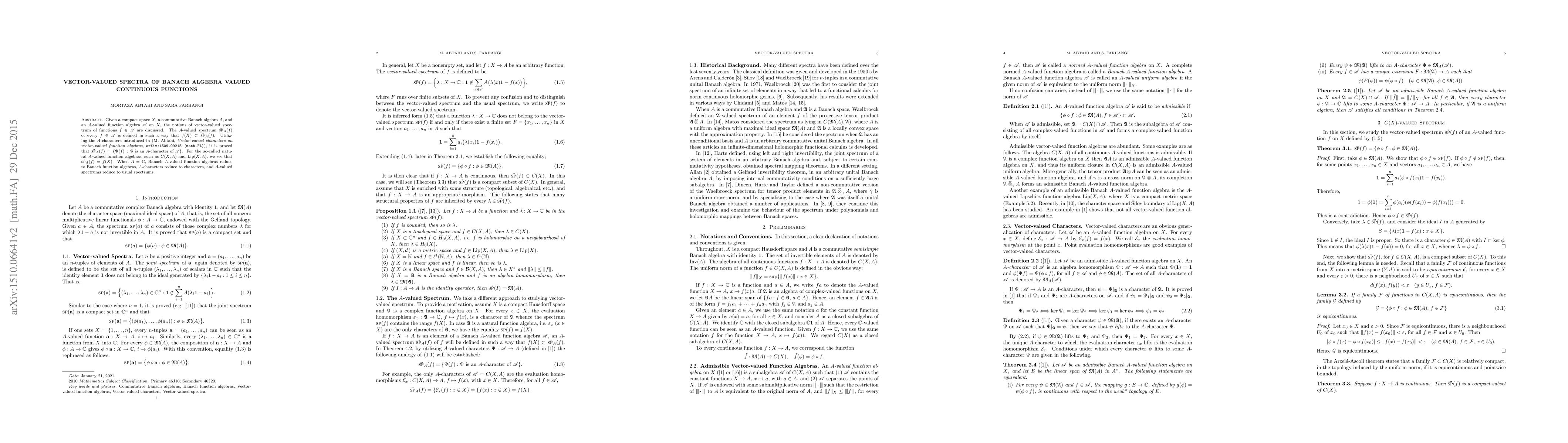 This paper defines the vector-valued spectrum $\vec{SP}_A(f)$ for $A$-valued continuous functions on a compact space $X$, showing that it equals $\{\Psi(f):\text{$\Psi$ is an $A$-character of $\mathscr{A}$}\}$. For natural $A$-valued function algebras like $C(X,A)$, $\vec{SP}_A(f)$ coincides with $f(X)$.