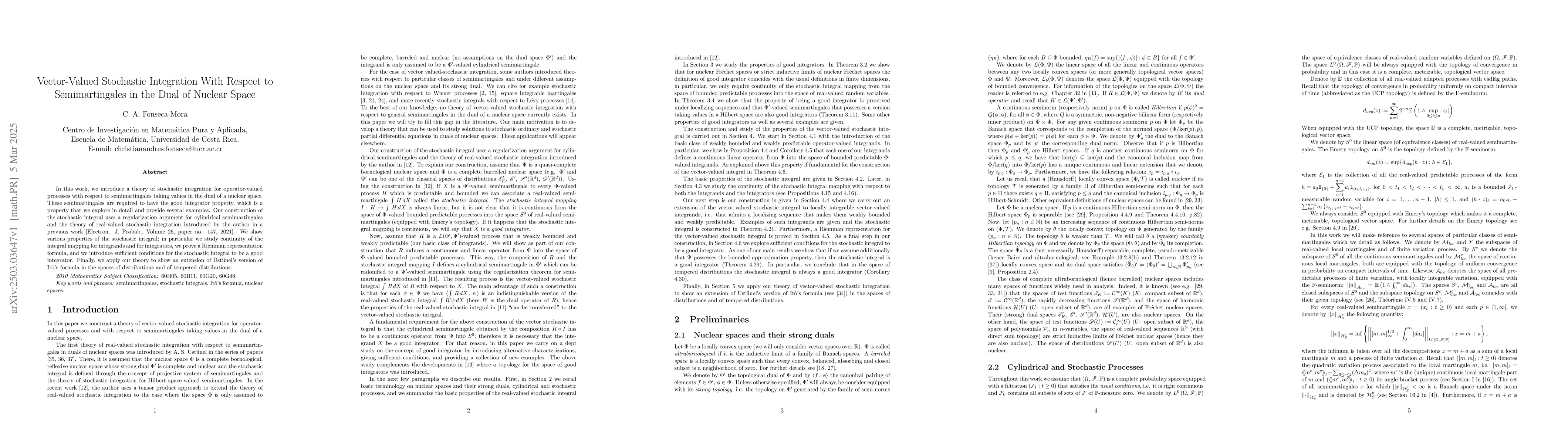 The paper presents a novel approach to vector-valued stochastic integration using the dual of nuclear spaces, along with a detailed examination of the good integrator property and associated integral representation formulas.