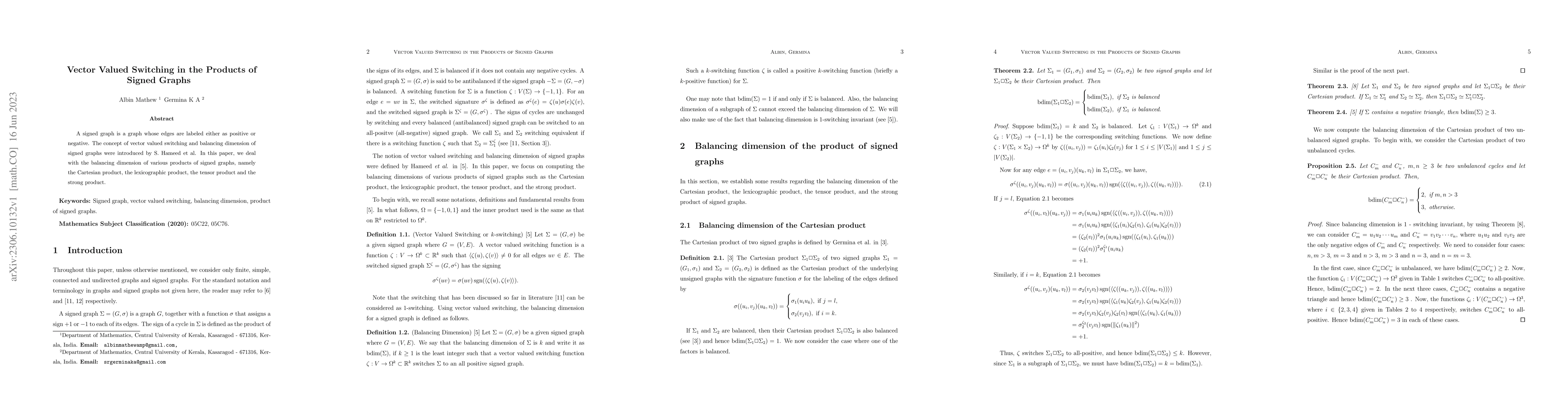 This paper investigates the balancing dimension of signed graphs under different products, including Cartesian, lexicographic, tensor, and strong products, building on the concept of vector valued switching introduced by S. Hameed et al. The study aims to understand how these products affect the balancing dimension of signed graphs.
