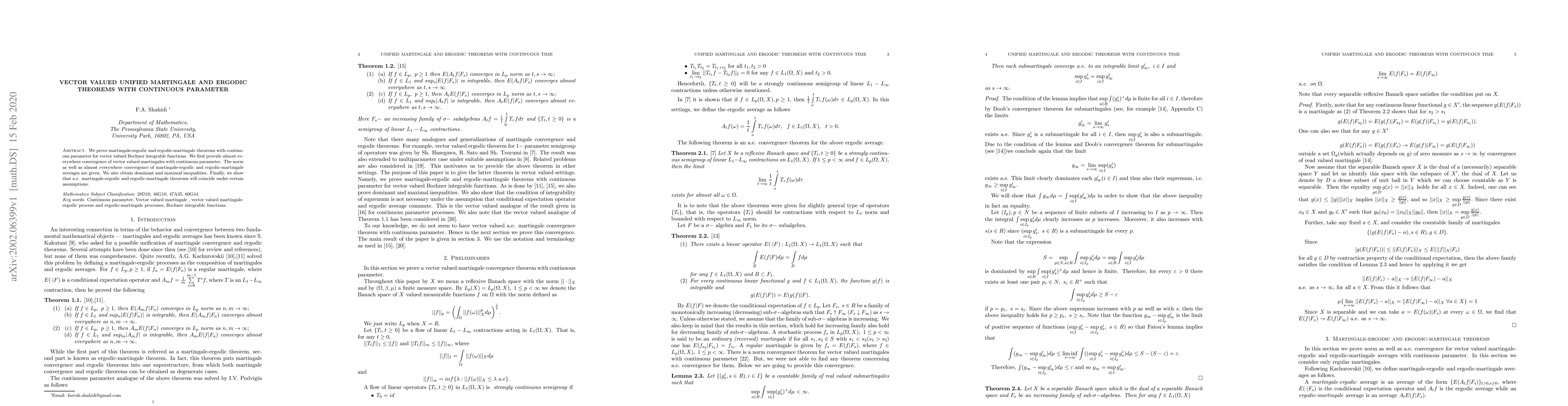 This paper proves martingale-ergodic and ergodic-martingale theorems for vector valued Bochner integrable functions with continuous parameters, establishing almost everywhere convergence and deriving norm convergence, dominant, and maximal inequalities. It also demonstrates the equivalence of these theorems under specific conditions.
