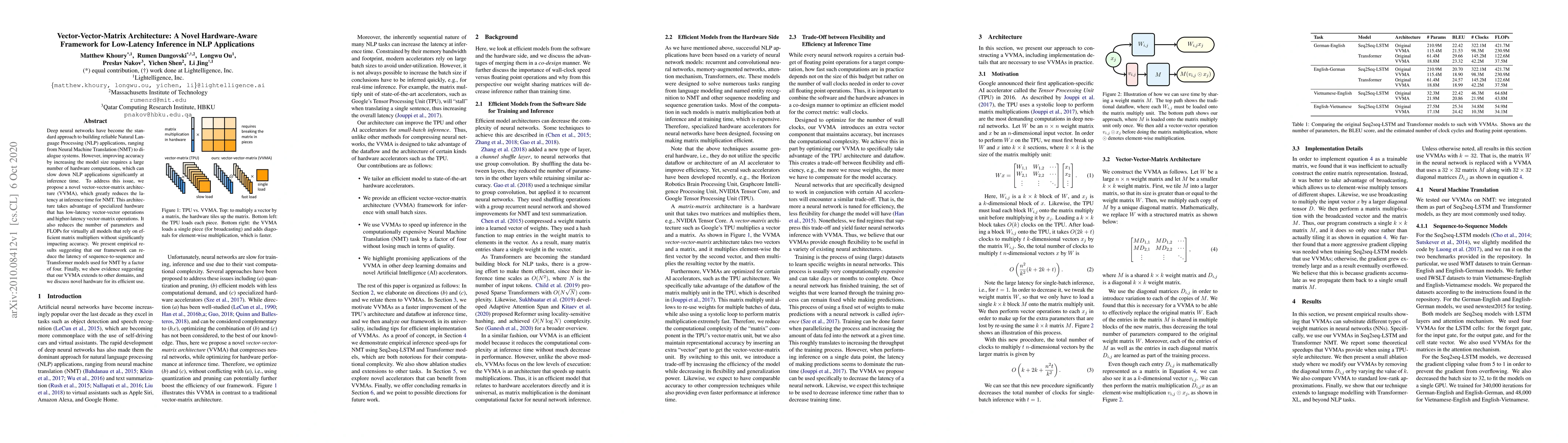 This paper proposes a vector-vector-matrix architecture (VVMA) to reduce inference latency in NLP applications like Neural Machine Translation by leveraging specialized hardware. It achieves significant reductions in latency without compromising accuracy.