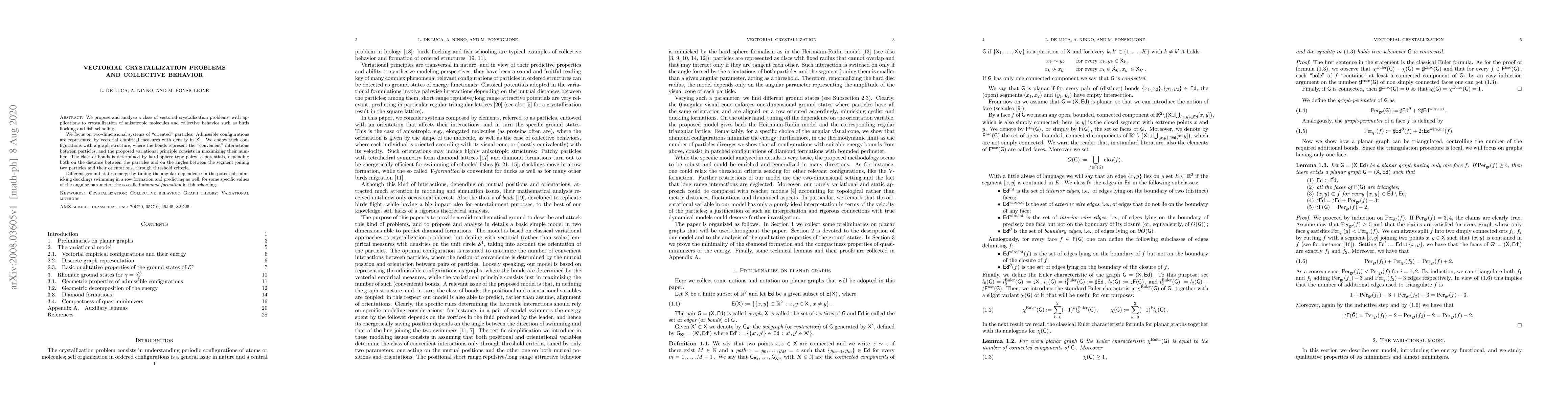 This paper proposes and analyzes vectorial crystallization problems for anisotropic molecules and collective behaviors like bird flocking and fish schooling. It focuses on two-dimensional systems of oriented particles, maximizing "convenient" interactions through a graph structure, and predicts different ground states, including diamond formations in fish schooling, by tuning angular dependencies in the potential.