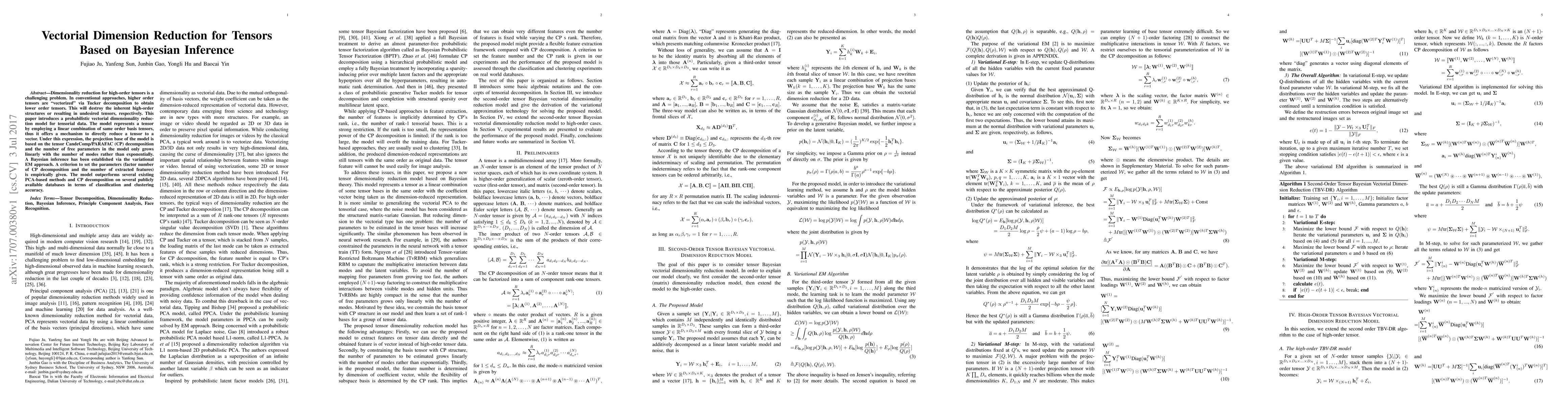 This paper proposes a probabilistic vectorial dimensionality reduction model for tensors that preserves high-order structures by using a linear combination of same-order basis tensors. The Bayesian inference is implemented via a variational EM approach, and the model outperforms existing PCA-based methods in classification and clustering accuracy.