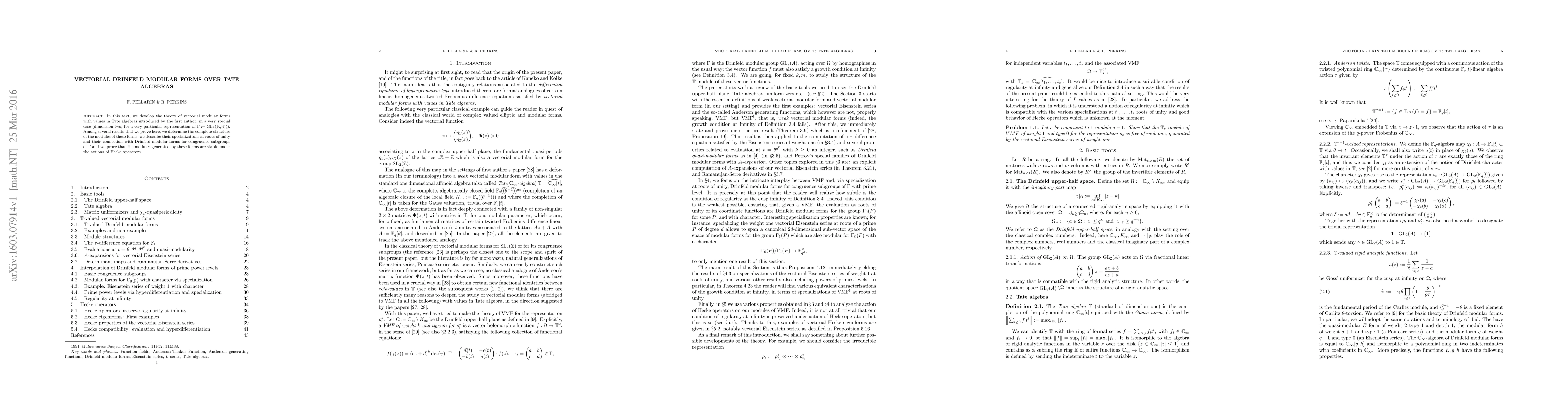 This paper develops a theory of vectorial Drinfeld modular forms over Tate algebras, focusing on their structure, specializations at roots of unity, and connection to other types of modular forms.
