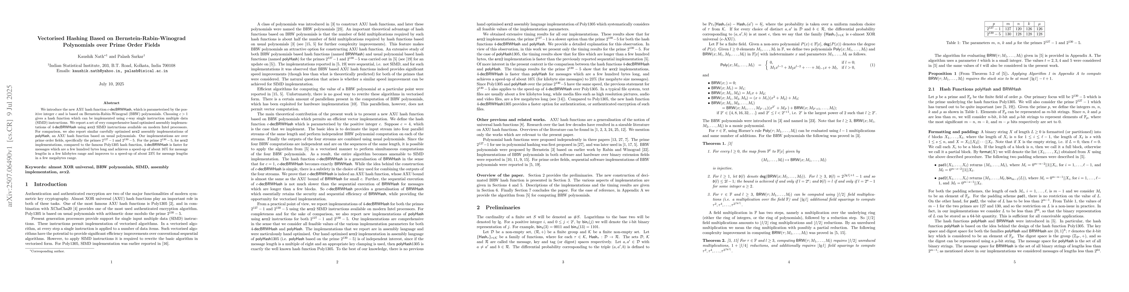 We introduce the new AXU hash function decBRWHash, which is parameterised by the positive integer $c$ and is based on Bernstein-Rabin-Winograd (BRW) polynomials. Choosing $c>1$ gives a hash function which can be implemented using $c$-way single instruction multiple data (SIMD) instructions. We report a set of very comprehensive hand optimised assembly implementations of 4-decBRWHash using avx2 SIMD instructions available on modern Intel processors. For comparison, we also report similar carefully optimised avx2 assembly implementations of polyHash, an AXU hash function based on usual polynomials. Our implementations are over prime order fields, specifically the primes $2^{127}-1$ and $2^{130}-5$. For the prime $2^{130}-5$, for avx2 implementations, compared to the famous Poly1305 hash function, 4-decBRWHash is faster for messages which are a few hundred bytes long and achieves a speed-up of about 16% for message lengths in a few kilobytes range and improves to a speed-up of about 23% for message lengths in a few megabytes range.