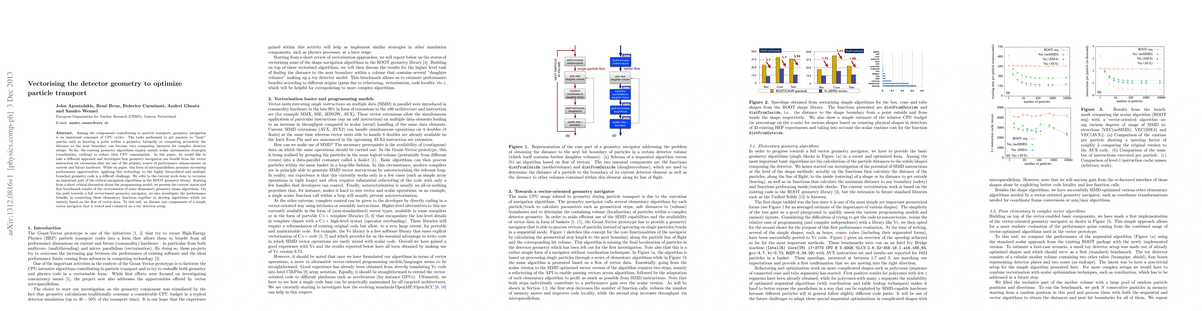 Among the components contributing to particle transport, geometry navigation is an important consumer of CPU cycles. The tasks performed to get answers to "basic" queries such as locating a point within a geometry hierarchy or computing accurately the distance to the next boundary can become very computing intensive for complex detector setups. So far, the existing geometry algorithms employ mainly scalar optimisation strategies (voxelization, caching) to reduce their CPU consumption. In this paper, we would like to take a different approach and investigate how geometry navigation can benefit from the vector instruction set extensions that are one of the primary source of performance enhancements on current and future hardware. While on paper, this form of microparallelism promises increasing performance opportunities, applying this technology to the highly hierarchical and multiply branched geometry code is a difficult challenge. We refer to the current work done to vectorise an important part of the critical navigation algorithms in the ROOT geometry library. Starting from a short critical discussion about the programming model, we present the current status and first benchmark results of the vectorisation of some elementary geometry shape algorithms. On the path towards a full vector-based geometry navigator, we also investigate the performance benefits in connecting these elementary functions together to develop algorithms which are entirely based on the flow of vector-data. To this end, we discuss core components of a simple vector navigator that is tested and evaluated on a toy detector setup.