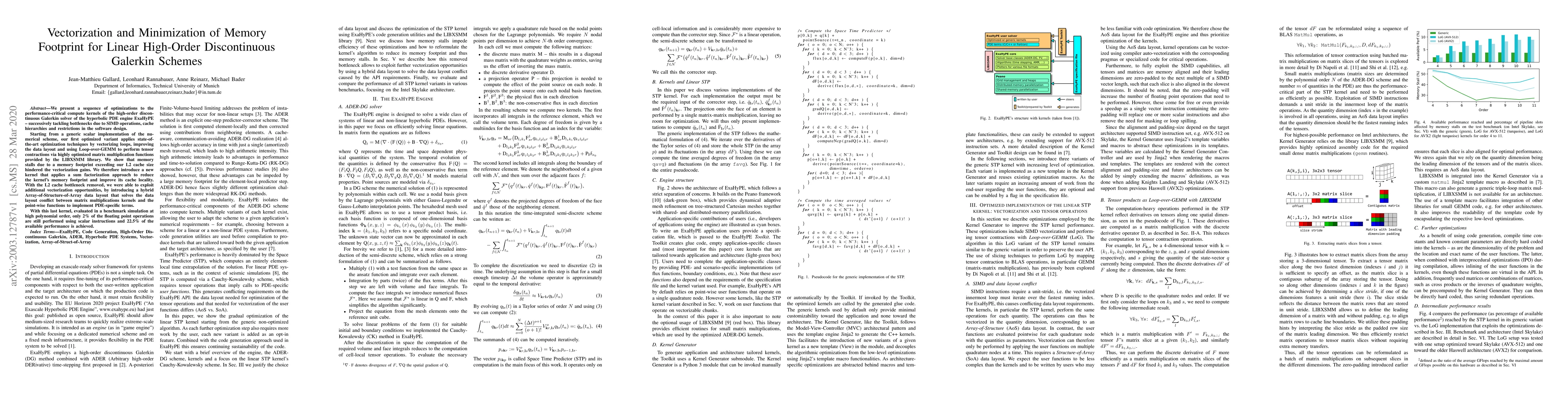 This research paper details optimizations for high-order discontinuous Galerkin solvers used in hyperbolic PDE computations. Initial vectorization and improved data layouts yield performance gains, but L2 cache limitations persist. Introducing a sum factorization kernel to reduce memory footprint and a hybrid data layout to resolve layout conflicts results in only 2% scalar operations and 22.5% performance achievement in a high-order PDE simulation.