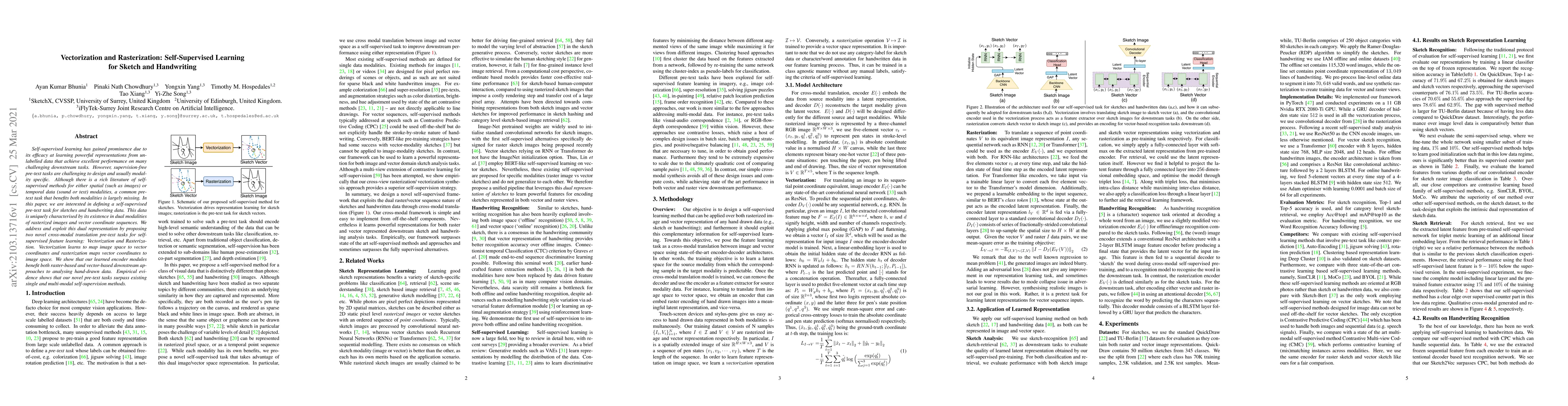 Self-supervised learning has gained prominence due to its efficacy at learning powerful representations from unlabelled data that achieve excellent performance on many challenging downstream tasks. However supervision-free pre-text tasks are challenging to design and usually modality specific. Although there is a rich literature of self-supervised methods for either spatial (such as images) or temporal data (sound or text) modalities, a common pre-text task that benefits both modalities is largely missing. In this paper, we are interested in defining a self-supervised pre-text task for sketches and handwriting data. This data is uniquely characterised by its existence in dual modalities of rasterized images and vector coordinate sequences. We address and exploit this dual representation by proposing two novel cross-modal translation pre-text tasks for self-supervised feature learning: Vectorization and Rasterization. Vectorization learns to map image space to vector coordinates and rasterization maps vector coordinates to image space. We show that the our learned encoder modules benefit both raster-based and vector-based downstream approaches to analysing hand-drawn data. Empirical evidence shows that our novel pre-text tasks surpass existing single and multi-modal self-supervision methods.