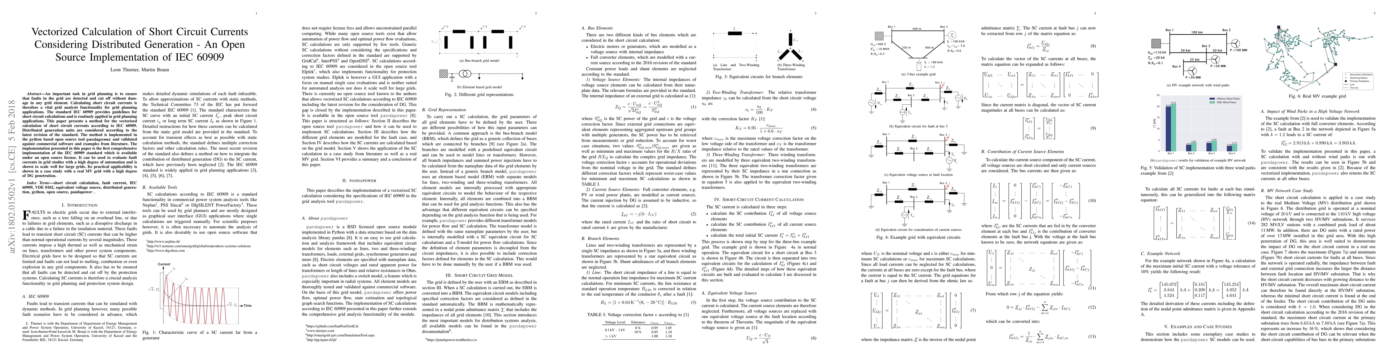 An important task in grid planning is to ensure that faults in the grid are detected and cut off without damage in any grid element. Calculating short circuit currents is therefore a vital grid analysis functionality for grid planning applications. The standard IEC 60909 provides guidelines for short circuit calculations and is routinely applied in grid planning applications. This paper presents a method for the vectorized calculation of short circuit currents according to IEC 60909. Distributed generation units are considered according to the latest revision of the standard. The method is implemented in the python based open source tool pandapower and validated against commercial software and examples from literature. The implementation presented in this paper is the first comprehensive implementation of the IEC 60909 standard which is available under an open source license. It can be used to evaluate fault currents in grid studies with a high degree of automation and is shown to scale well for large grids. Its practical applicability is shown in a case study with a real MV grid with a high degree of DG penetration.
