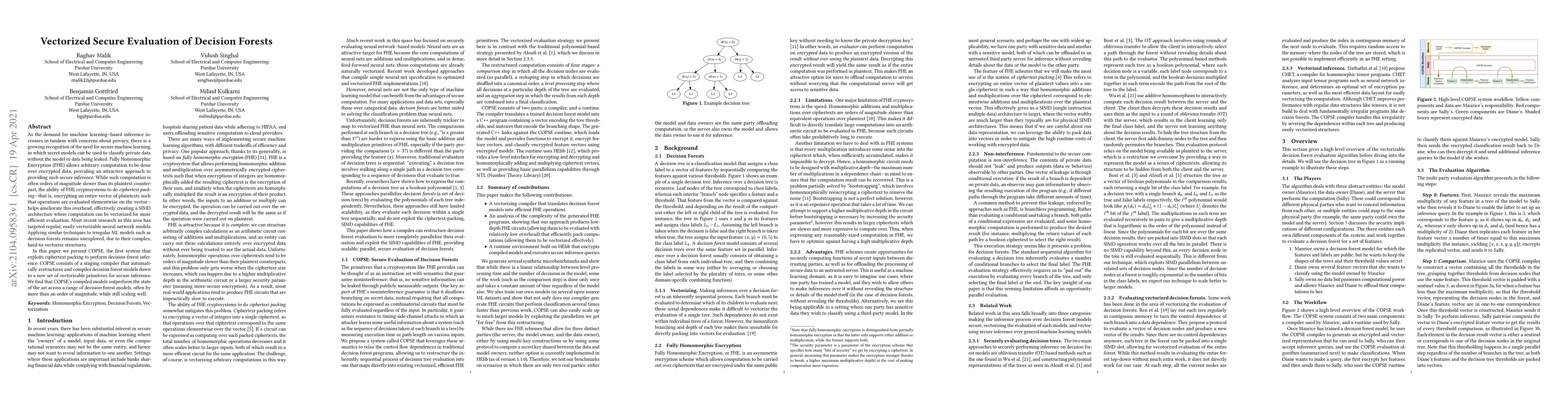 This paper introduces COPSE, the first system to enable vectorized secure evaluation of decision forests using Fully Homomorphic Encryption (FHE). COPSE employs a staging compiler to transform decision forests into vectorizable primitives, achieving significant performance improvements over existing methods.