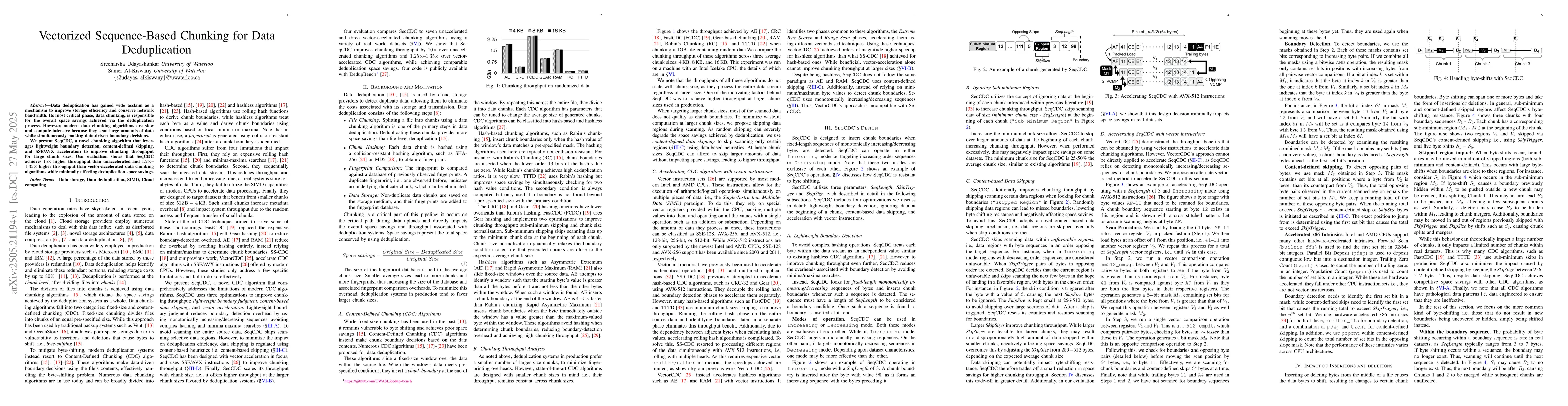 The paper introduces SeqCDC, a novel chunking algorithm that utilizes lightweight boundary detection, content-defined skipping, and SSE/AVX acceleration for efficient data chunking in deduplication processes.