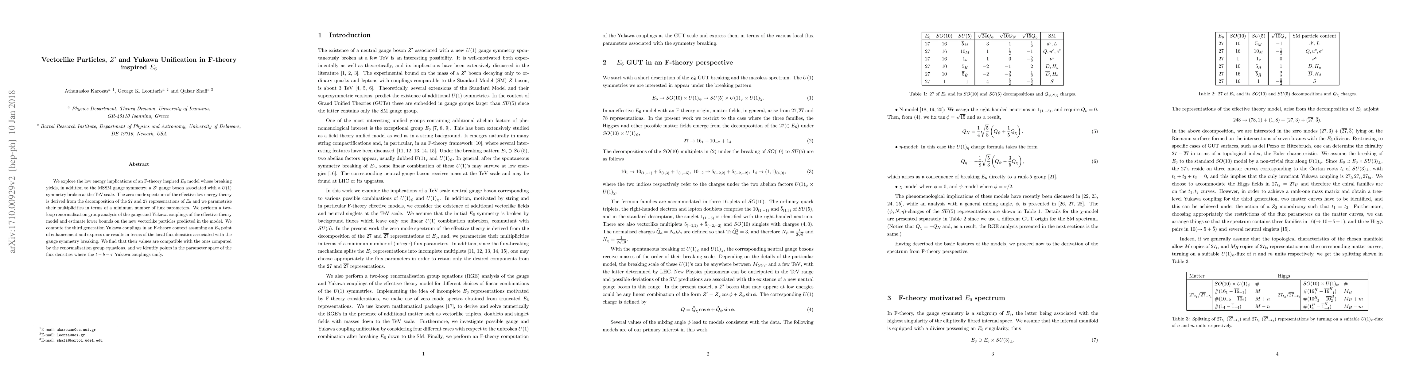 This paper explores an F-theory inspired $E_6$ model featuring a $Z'$ gauge boson and examines its low energy implications, including a two-loop renormalisation group analysis of gauge and Yukawa couplings. It finds compatibility between computed Yukawa couplings and identifies parameter regions where $t-b-\tau$ Yukawa unification occurs.