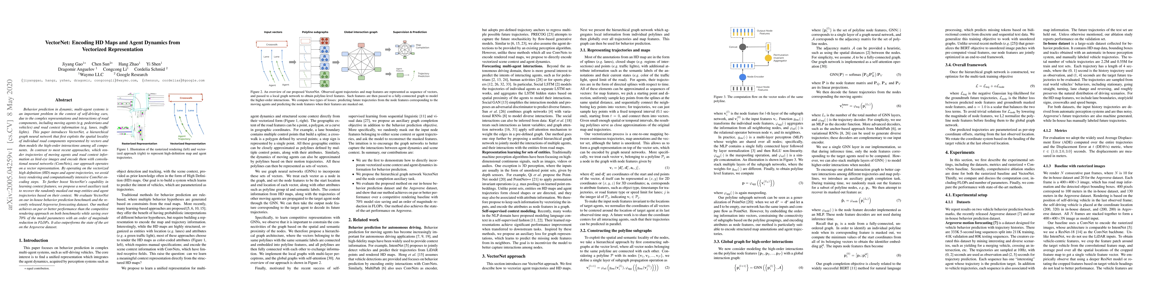 VectorNet is a hierarchical graph neural network designed to predict behavior in dynamic, multi-agent systems by encoding HD maps and agent dynamics from vectorized representations. It outperforms traditional ConvNet-based methods by avoiding lossy rendering and reducing computational costs, achieving comparable or better performance with significantly fewer parameters and FLOPs.