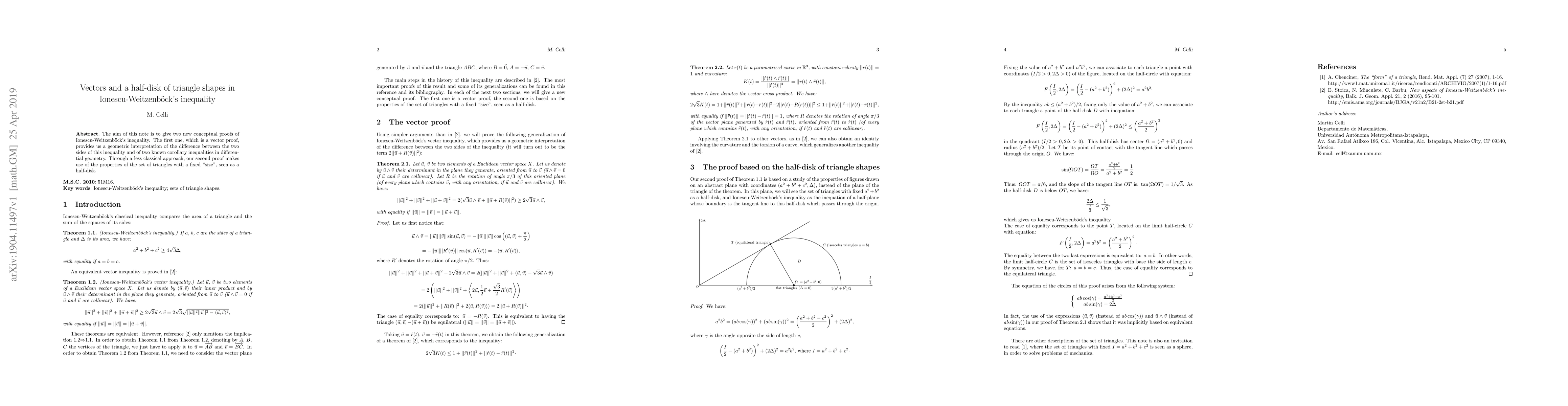 The aim of this note is to give two new conceptual proofs of Ionescu-Weitzenb\"ock's inequality. The first one, which is a vector proof, provides us a geometric interpretation of the difference between the two sides of this inequality and of two known corollary inequalities in differential geometry. Through a less classical approach, our second proof makes use of the properties of the set of triangles with a fixed "size", seen as a half-disk.
