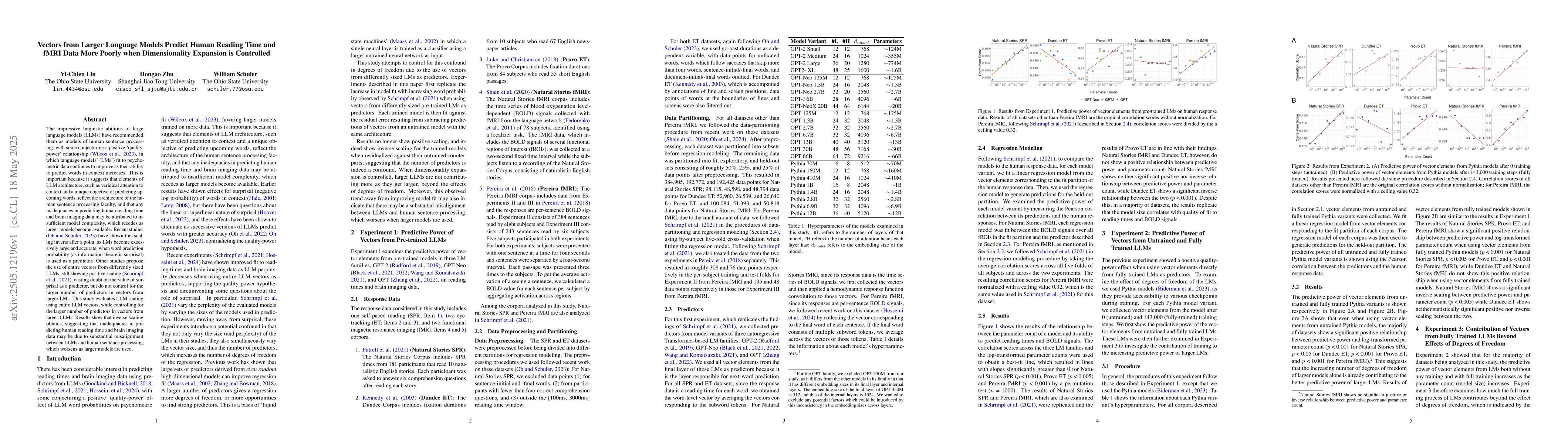 Demonstrates that controlling for dimensionality expansion reveals an inverse scaling relationship between LLM size and prediction accuracy for human reading times and fMRI data.
